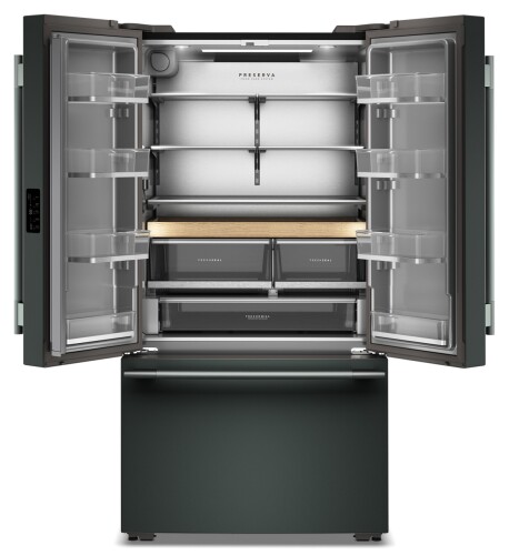 - wows from the inside out with premium craftsmanship and design. Wood-look trim, metallic touchpoints, smoked crisper bins and ultra-bright LED lighting pop against the stunning silver-colored finish.