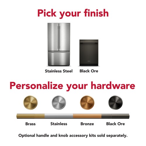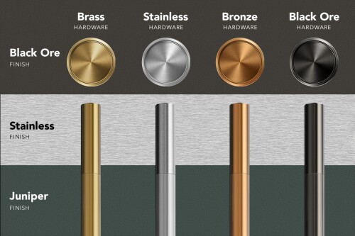 - with a curated palette of exterior finishes and mixed metal hardware. Pick from lush Juniper, warm Black Ore and classic Stainless Steel finishes, all with matching handles. Personalize your hardware with optional handle accessory kits in Brass, Bronze, Black Ore and Stainless Steel.