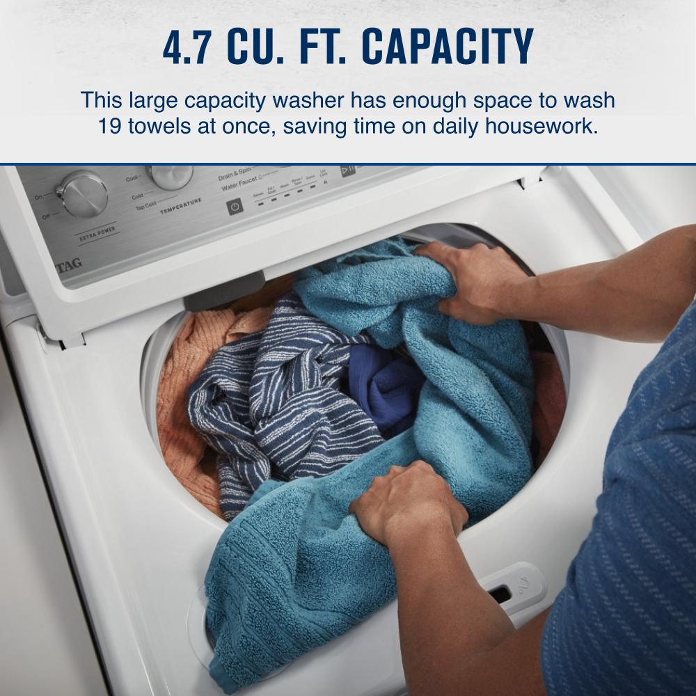 - With 4.8 cu. ft. capacity, you can run fewer cycles while fitting in even more loads. This large capacity washer has enough space to wash 19 towels at once, saving time on daily housework.
