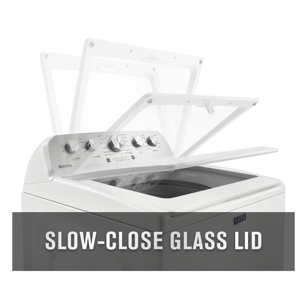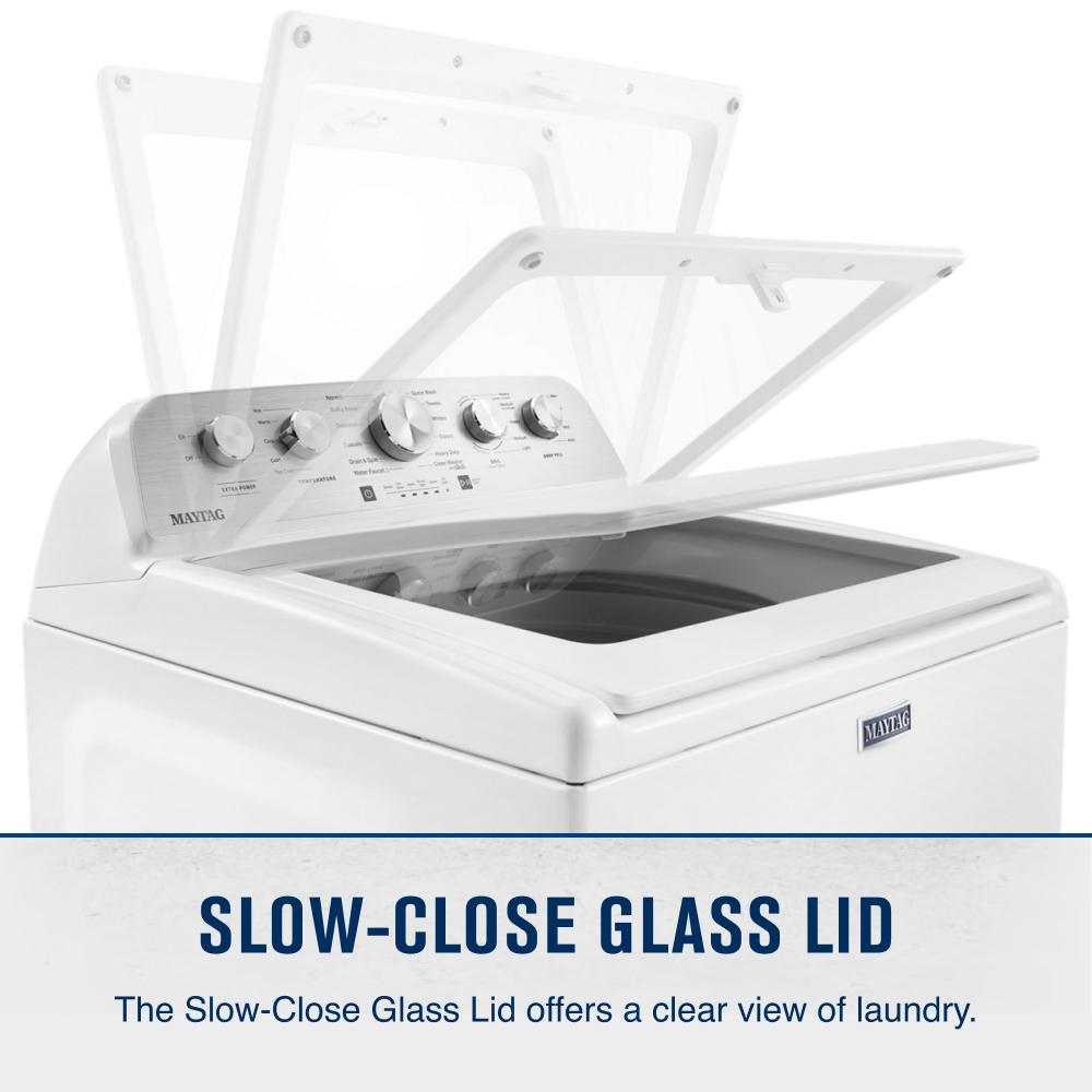 - Keep track of the action inside your washer with the slow-close glass lid. It offers a clear view of laundry and closes softly without slamming.