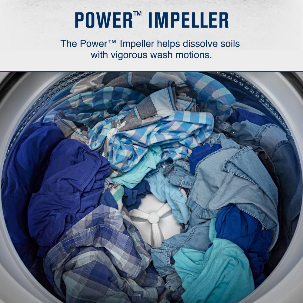 - Trust the Power™ impeller to help dissolve stains and soils. Vigorous wash motions and triple action spray keep clothes thoroughly soaked with water and detergent.