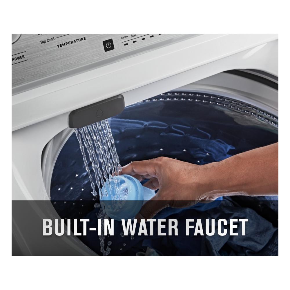 - The built-in water faucet rinses, spot treats or soaks clothes right in the washer—no extra steps needed. After three hours, the water drains, leaving clothes ready for the wash cycle.
