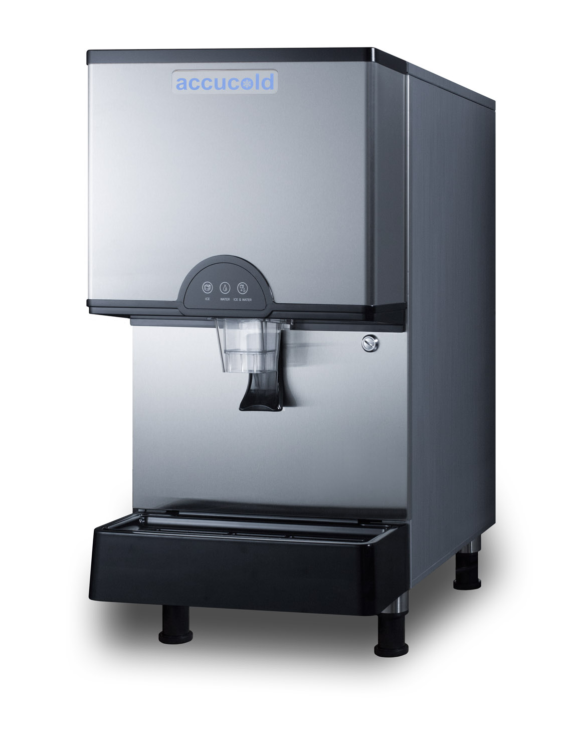 Experience the ultimate in convenience with the commercially approved Accucold countertop water and ice dispenser.The AIWD282 is ETL-S listed to NSF-12 commercial standards. Measuring 18 3/4 inches from the front leg to the unit rear makes this a perfect fit on standard counters. This unit can produce up to 282 pounds of ice per day. Three dispenser functions - ice, water, or ice+water - provide expanded functionality, while the illuminated display ensures easy access and control of the unit. Adjustable legs offer flexible height options, while the stainless steel front provides a professional look. The removable tray and sealed back make for easy cleaning. This unit comes equipped with UV lighting in the dispenser. The AIWD282 must be used with a drain and should be placed in a space that allows for draining below the unit. It is top vented.With its countertop footprint and large production output, the AIWD282 is the perfect unit for hospital waiting areas, break rooms, or similar settings looking for a water and ice dispenser that is attractive and efficient.Note: A water filtration system is available and recommended for optimal performance of the unit. See FILTER282TWIN at www.accucold.com or contact our sales department at 718-893-3900 for more information.