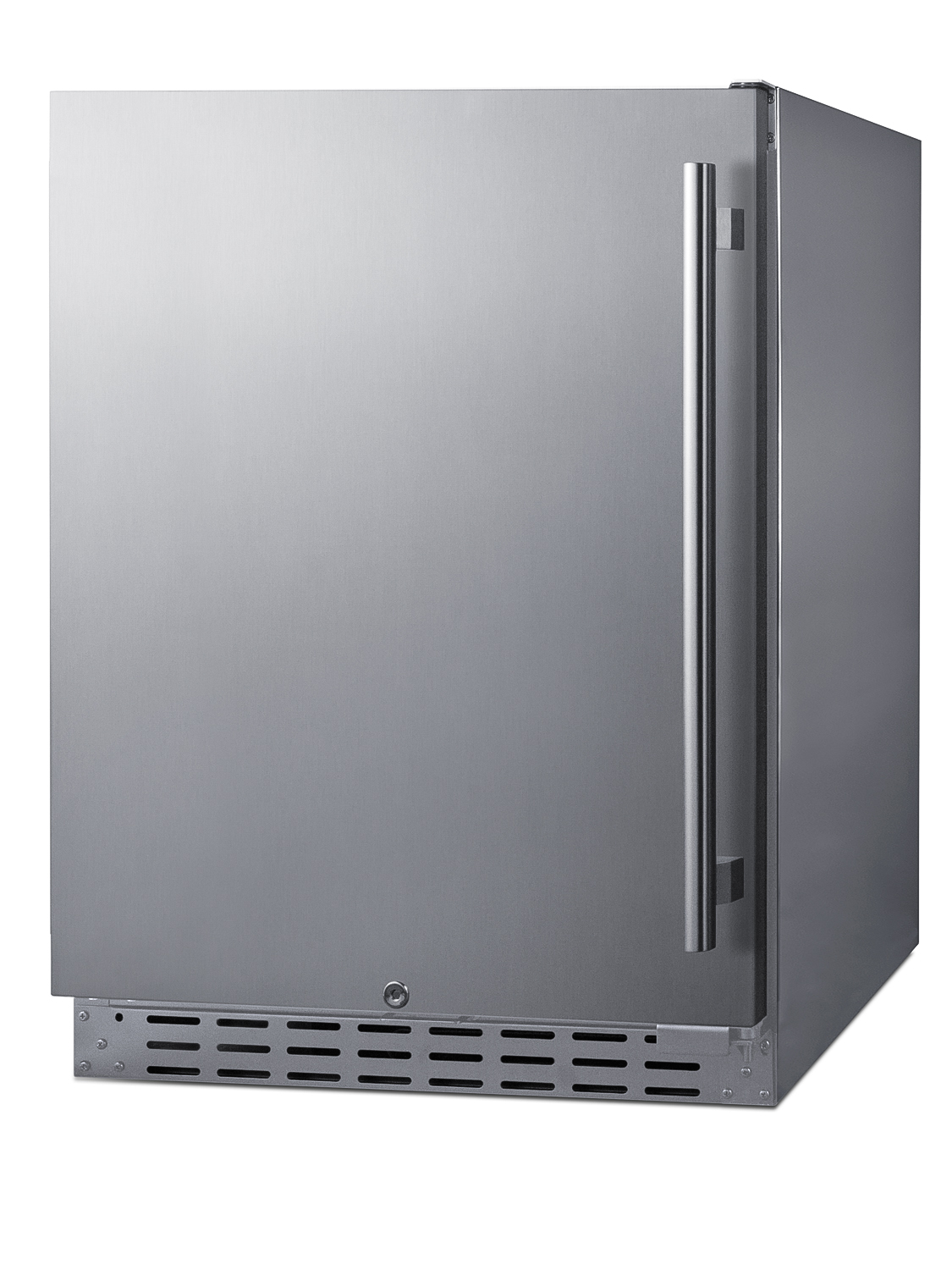 Summit's innovative lineup features built-in undercounter all-refrigerators designed for installation under lower ADA-compliant counters, with advanced weatherproof construction for convenient use in any outdoor kitchen.The AL55OSCSSLHD is a 24" wide outdoor refrigerator that meets residential and commercial standards and is ETL-S listed to NSF-7. Its sealed rear and complete stainless steel exterior offer true luxury designed to last outdoors. The front-breathing system allows built-in installation, while the fully finished cabinet allows freestanding use. The door is user-reversible and includes a front lock and pro-style handle. This unit comes with a left-hand door swing (for a right-hand version, see model AL55OSCSS).A temperature alarm offers added security should the temperature exceed the setpoint, and the optional Sabbath Mode can disable certain electrical features during periods of religious observance. The automatic defrost system keeps the unit running efficiently with little user maintenance, and the internal fan ensures it is evenly cooled. Inside, the AL55OSCSSLHD has a digital control panel that allows you to manage the unit's temperature with ease. An adjustable temperature range between 36 and 46ºF ensures contents are kept cold. Three easy-glide glass shelves that extend 50% provide flexible storage, and the shelving brake system keeps unit contents safe when loading and unloading. Two-door racks are ideal for keeping condiments within easy reach, while the slotted floor ensures easy storage of bottles. The dimmable soft LED lighting in a gentle blue hue with three brightness settings offers an attractive and efficient presentation inside the white interior.With its advanced user features and versatile design, the AL55OSCSSLHD is an excellent addition to any ADA-compliant outdoor setting looking for a refrigerator with a modern, elegant look.