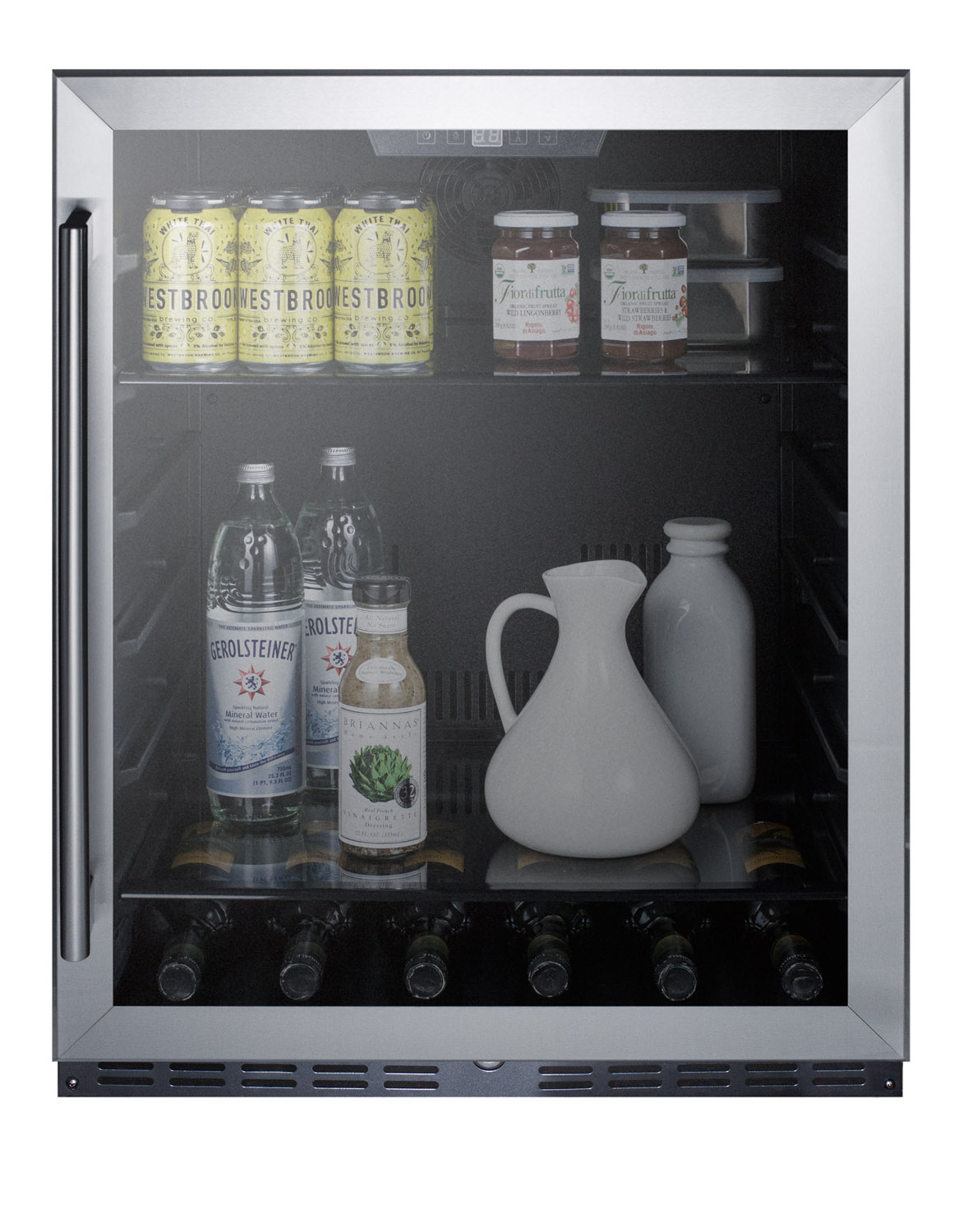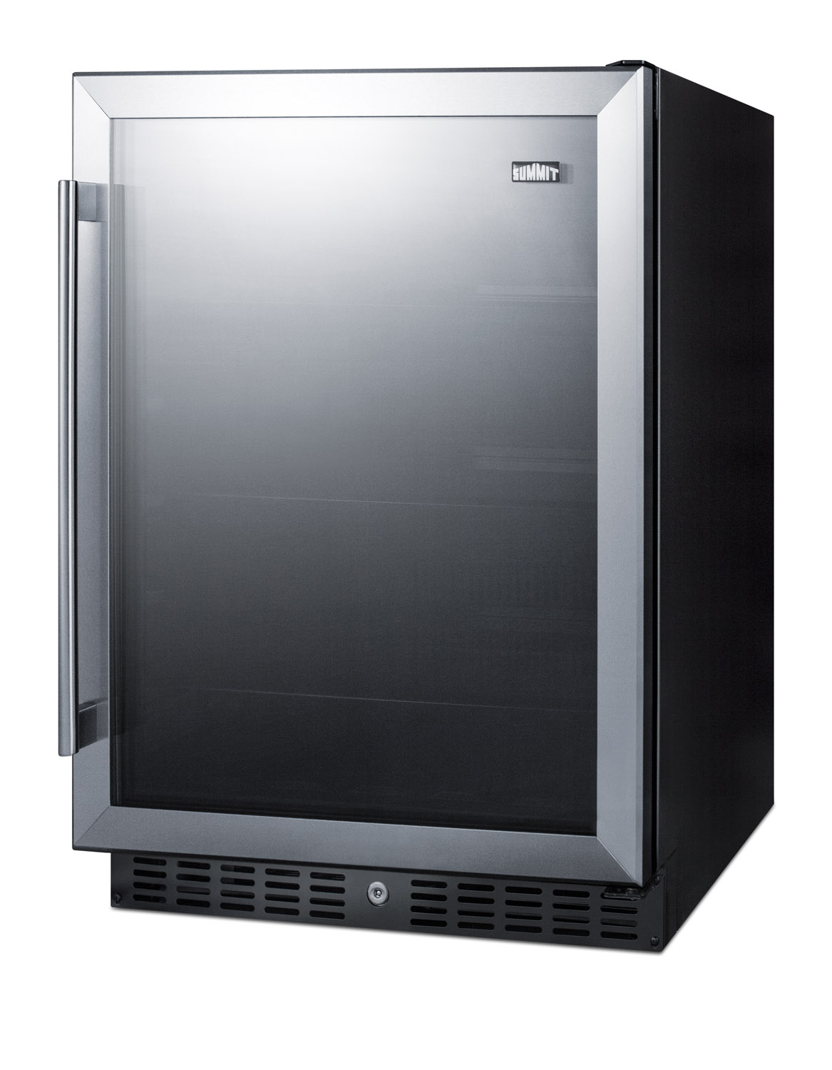 SUMMIT's extensive selection of built-in refrigerators brings quality and style to commercial settings designed to incorporate lower ADA compliant counter height.Sized with a convenient 24" footprint, the AL57G is just 32" high to fit under lower counters complying with ADA guidelines for accessibility in commercial settings. The fully finished black cabinet allows freestanding use, while the front-breathing system also allows this unit to be built-in with minimum clearance. This unit has a user-reversible double pane tempered glass door with attractive stainless steel trim. A stainless steel handle completes the look and a factory installed lock in the kickplate offers additional security. The flush back design helps to make cleaning easier, while the right angle cord offers added space savings.Inside, the AL57G utilizes frost-free operation with fan-forced cooling to ensure low maintenance and even temperature distribution. Recessed LED lighting offers an attractive yet efficient look. The digital thermostat makes it easy to manage the interior temperature. This unit includes adjustable glass shelves for flexible, spill-proof storage. The floor is specially slotted to hold bottles in place. Additional features include an open door alarm, high temperature alarm, and Sabbath mode setting that lets you disable some of the electrical elements during periods of observance.The AL57G refrigerator is ETL-S listed to NSF-7 commercial standards. With its deluxe style and user-friendly features, this unit is the perfect choice for bars, restaurants, hotel lobbies, waiting areas, and other settings looking to store beverages under the proper conditions.