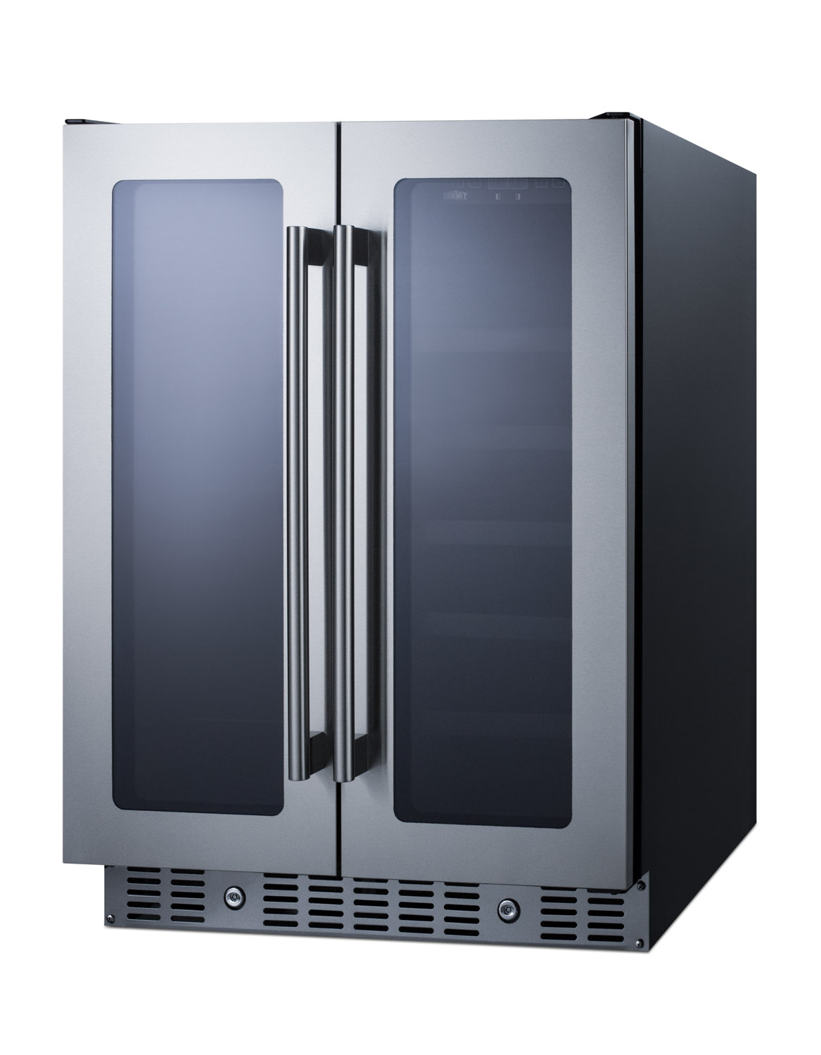 NOTE: product image may vary slightly from actual product. Summit offers a unique selection of built-in wine and beverage coolers for use in ADA compliant settings, with user-friendly features and luxury design.Sized with a convenient 24" footprint, the ALFD24WBV is 32" high, allowing it to fit under lower ADA compliant counters. Adjustable leveling legs let you raise the height up to 33.5" for added versatility. The front-breathing system allows built-in installation, while the fully finished black cabinet also allows freestanding use. This model has a French door swing, with two double pane tempered glass doors in a seamless stainless steel trim. Each door includes a front lock and pro style handle in brushed stainless steel.The ALFD24WBV features two distinct temperature zones to best store beverages and wine at their proper temperatures. The digital temperature controls make it easy to manage the temperature of each compartment, with a readout switchable from Fahrenheit to Celsius at the touch of a button. The left side includes adjustable glass shelves for spill-proof beverage storage and features a 36 to 43ºF temperature range. The right compartment includes adjustable wooden shelves in a jet black finish to store red or white wine between 41 and 72ºF. LED lighting offers an attractive and energy efficient presentation. This unit is equipped with audible alarms that warn if the doors are opened for over one minute and if the temperature exceeds the recommended range. Sabbath mode allows you to disable certain electrical features during periods of observance. With its unique design and advanced features, the ALFD24WBV offers versatile storage for any undercounter space. Additional ADA compliant choices are available in Summit's line. Browse our website for more information.