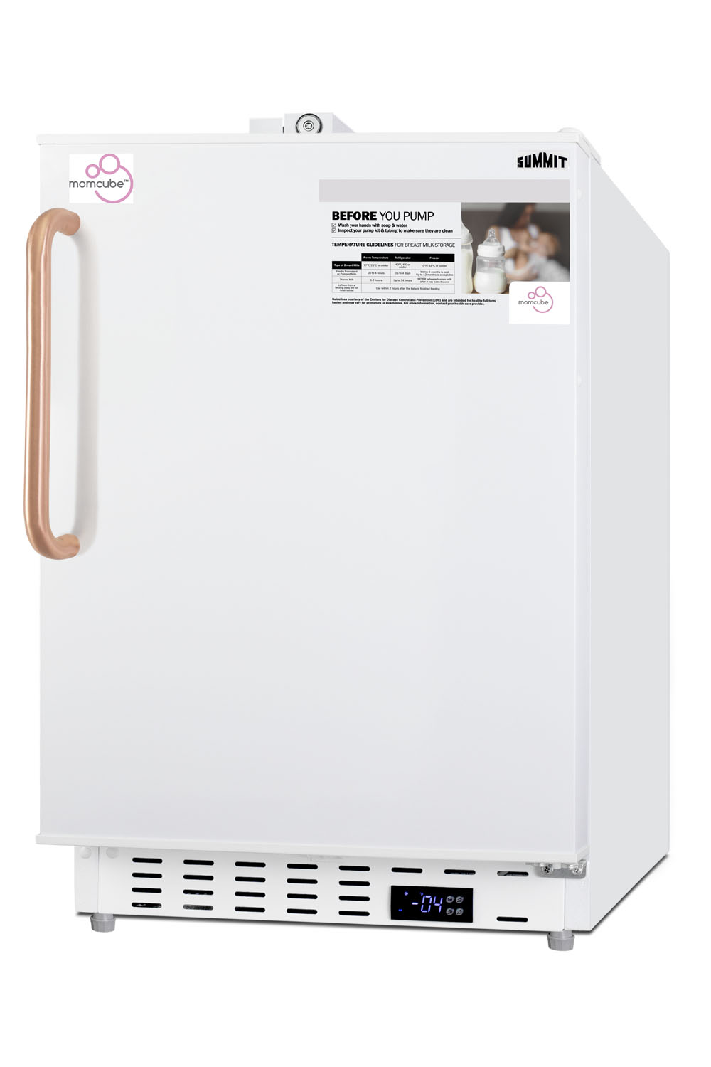 Summit Appliance offers a quality selection of MOMCUBE® all-freezers designed for reliable long-term storage of breast milk in residential settings, with advanced features for user convenience. The ALFZ36LMCTBC is a MOMCUBE® all-freezer with a flexible design that can be built-in under counters or used freestanding. Sized just under 20" wide, it's perfect for homes, offices, and other settings in need of extra storage space for nursing mothers. The door is 3" thick for efficient insulation. A factory-installed keyed lock located toward the top provides convenient security as needed. This unit comes with a right angle cord to allow for easier placement without added depth. A digital thermostat, located in the kickplate, makes for easy temperature management with a readout in Fahrenheit or Celsius. The ALFZ36LMCTBC includes a factory-installed towel bar style handle made from pure copper. Through its natural antimicrobial properties, copper will kill microbes, including viruses, in a shorter timeframe than most other metal surfaces allowing for a safer, cleaner user experience. Inside, the ALFZ36LMCTBC features an all-white interior for easy cleaning and viewing of contents. Static manual defrost operation provides efficient cooling inside the 2.68 cu.ft. interior. Three adjustable wire shelves afford optimal storage options for mothers storing ice packs, milk, or similar nursing-related items. Three removable door racks accommodate additional storage as needed. The user-set high and low temperature alarms provide added security should the temperature go beyond the setpoint, while the open door alarm sounds if the door is ajar over one minute for added peace-of-mind. These alarms can be disabled depending on your needs. With its convenient size and user-friendly features, the ALFZ36LMCTBC is the perfect solution for nursing mothers seeking dependable long-term breast milk storage in the home. For a non-locking version, see the ALFZ36MC.