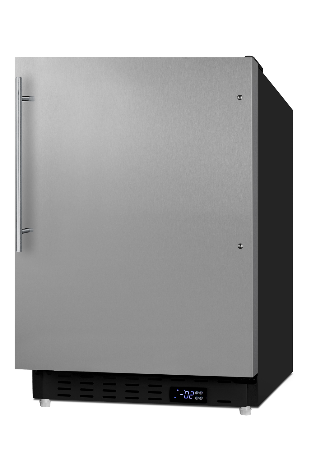 Summit Appliance offers a quality selection of 21" wide built-in undercounter all-freezers designed for installation under lower ADA compliant counters, with advanced features for user convenience. The ALFZ37BSSHV is sized at 32" high to fit under lower counters complying with ADA guidelines for accessibility. The fully finished textured black cabinet allows freestanding use, while the front-breathing system means this unit can be built-in with minimum clearance. The stainless steel, user-reversible door is 3" thick for efficient insulation, with a sleek handle with a thin 14mm diameter, a popular style that matches many common cabinet handles. This unit comes with a right angle cord to allow for easier placement without added depth. A digital thermostat, located in the kickplate, makes for easy temperature management with a readout in Fahrenheit or Celsius. Inside, the ALFZ37BSSHV features an all-white interior for easy cleaning and viewing of contents. Static manual defrost operation provides efficient cooling inside the 2.68 cu.ft. interior. Three adjustable wire shelves offer optimal storage options for large and small items, while three removable door racks accommodate additional storage as needed. The user-set high and low temperature alarms provide added security should the temperature go beyond the setpoint, while the open door alarm sounds if the door is ajar over one minute for added peace-of-mind. These alarms can be disabled depending on your needs. Sized at just 21" wide, the ALFZ37BSSHV is the perfect addition for space-challenged spaces seeking dependable freezer options in a durable design. For a complete set, pair this unit with the matching ALR47BSSHV all-refrigerator. Additional choices are available with a stainless steel cabinet and panel-ready exterior finishes.