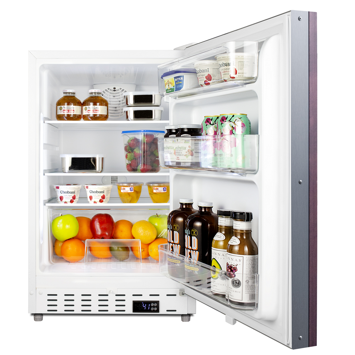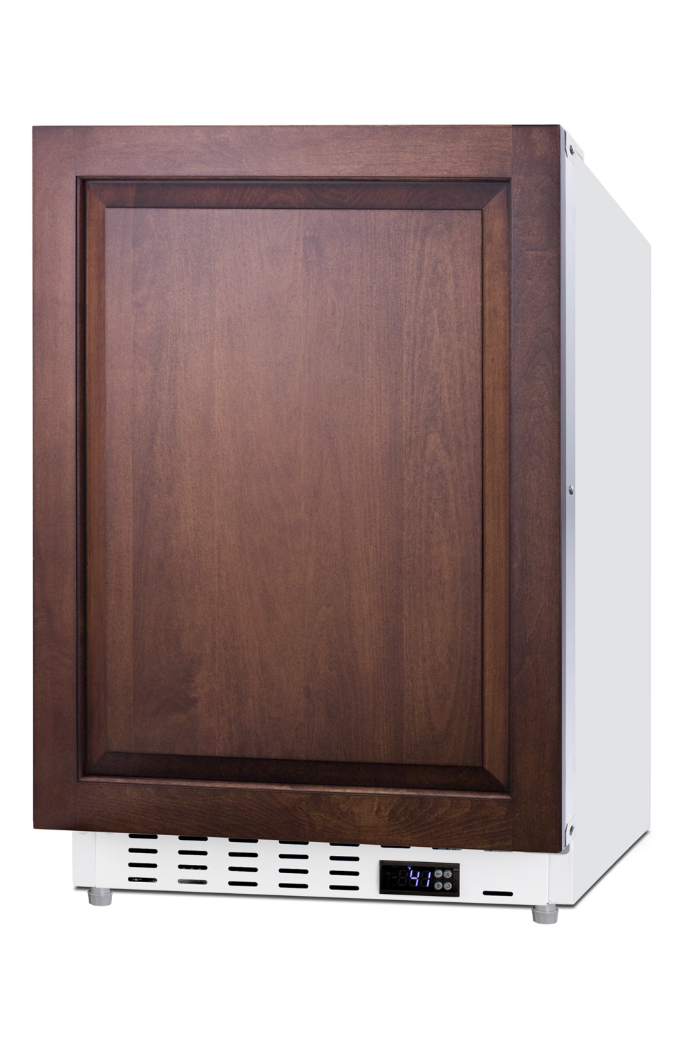 Summit Appliance offers a quality selection of 21" wide built-in undercounter all-refrigerators designed for installation under lower ADA compliant counters, with advanced features for user convenience.The ALR46WIF is sized at 32" high to fit under lower counters complying with ADA guidelines for accessibility. The fully finished textured white cabinet allows freestanding use, while the front-breathing system means this unit can be built-in with minimum clearance. The door is 3" thick for efficient insulation and features an integrated stainless steel frame designed to accept full panel overlays, allowing users to seamlessly blend the unit into their own cabinetry design (panel size: 19 13/16" W x 27 1/8" H). This unit comes with a right angle cord to allow for easier placement without added depth. A digital thermostat, located in the kickplate, makes for easy temperature management with a readout in Fahrenheit or Celsius. Inside, the ALR46WIF features an all-white interior for easy cleaning and viewing of contents. An LED light located toward the front of the unit attractively illuminates the interior when the door opens. Automatic defrost operation ensures minimal user maintenance, with an internal fan to help ensure even cooling throughout the 3.53 cu.ft. interior. Three adjustable glass shelves offer optimal storage options for large and small items, while a pull-out crisper drawer provides storage for fruits and vegetables. Three removable door racks accommodate additional storage as needed. The user-set high and low-temperature alarms provide added security should the temperature go beyond the setpoint, while the open door alarm sounds if the door is ajar over one minute for added peace-of-mind. These alarms can be disabled depending on your needs. Sized at just 21" wide, the ALR46WIF is the perfect addition for space-challenged environments seeking dependable freezer options in a durable design. For a complete set, pair this unit with the matching ALFZ36IF al