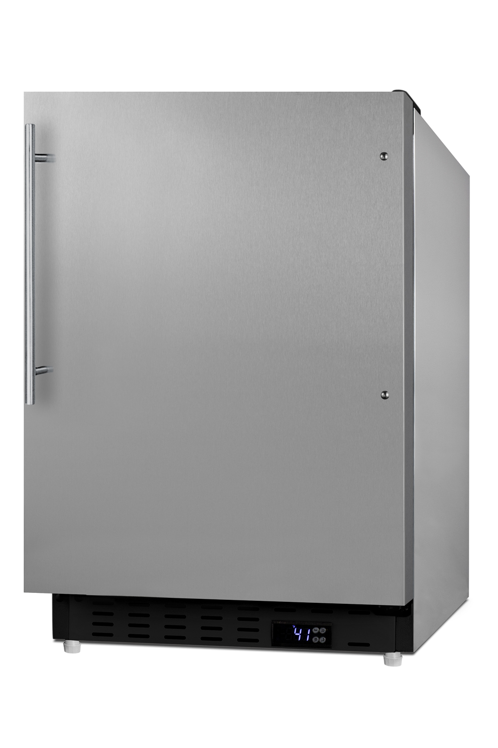 Summit Appliance offers a quality selection of 21" wide built-in undercounter all-refrigerators designed for installation under lower ADA compliant counters, with advanced features for user convenience.The ALR47BCSSHV is sized at 32" high to fit under lower counters complying with ADA guidelines for accessibility. The fully finished stainless steel cabinet allows freestanding use, while the front-breathing system means this unit can be built-in with minimum clearance. The user-reversible, stainless steel, door is 3" thick for efficient insulation, with a sleek vertical handle with a thin 14mm diameter, a popular style that matches many common cabinet handles. This unit comes with a right angle cord to allow for easier placement without added depth. A digital thermostat, located in the kickplate, makes for easy temperature management with a readout in Fahrenheit or Celsius. Inside, the ALR47BCSSHV features an all-white interior for easy cleaning and viewing of contents. An LED light located toward the front of the unit attractively illuminates the interior when the door opens. Automatic defrost operation ensures minimal user maintenance, with an internal fan to help ensure even cooling throughout the 3.53 cu.ft. interior. Three adjustable glass shelves offer optimal storage options for large and small items, while a pull-out crisper drawer provides storage for fruits and vegetables. Three removable door racks accommodate additional storage as needed. The user-set high and low-temperature alarms provide added security should the temperature go beyond the setpoint, while the open door alarm sounds if the door is ajar over one minute for added peace-of-mind. These alarms can be disabled depending on your needs. Sized at just 21" wide, the ALR47BCSSHV is the perfect addition for space-challenged environments seeking dependable freezer options in a durable design. For a complete set, pair this unit with the matching ALFZ37BCSSHV all-freezer. Additional choices with a blac