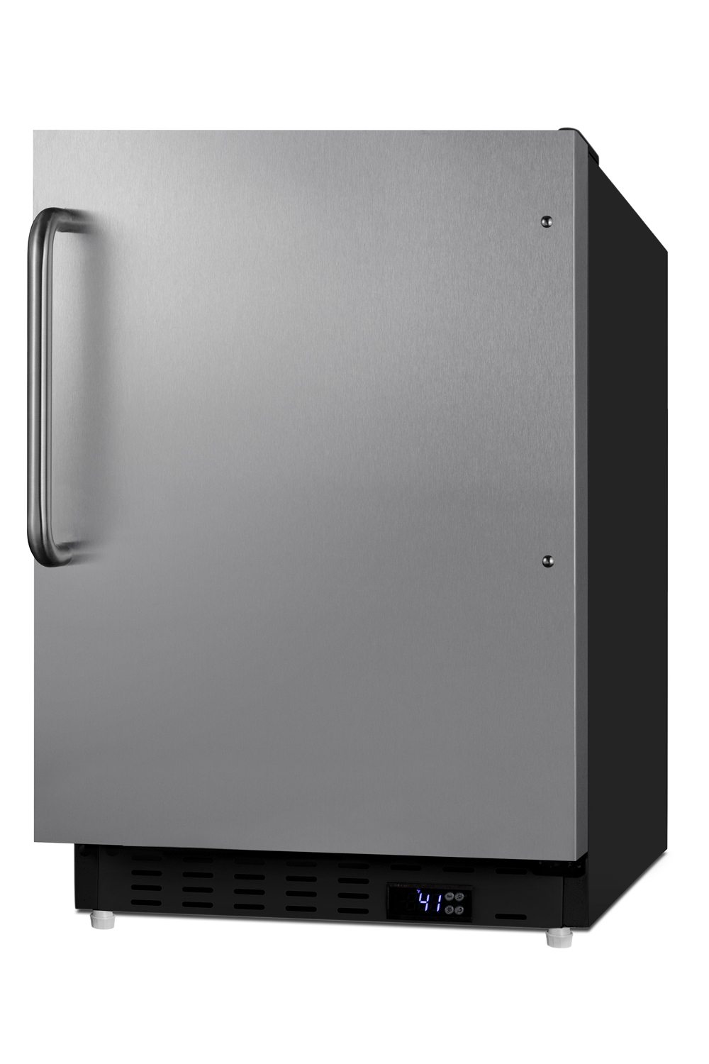 Summit Appliance offers a quality selection of 21" wide built-in undercounter all-refrigerators designed for installation under lower ADA compliant counters, with advanced features for user convenience.The ALR47BSSTB is sized at 32" high to fit under lower counters complying with ADA guidelines for accessibility. The fully finished textured black cabinet allows freestanding use, while the front-breathing system means this unit can be built-in with minimum clearance. The user-reversible, stainless steel door is 3" thick for efficient insulation, with a curved towel bar handle included for added convenience. This unit comes with a right angle cord to allow for easier placement without added depth. A digital thermostat, located in the kickplate, makes for easy temperature management with a readout in Fahrenheit or Celsius. Inside, the ALR47BSSTB features an all-white interior for easy cleaning and viewing of contents. An LED light located toward the front of the unit attractively illuminates the interior when the door opens. Automatic defrost operation ensures minimal user maintenance, with an internal fan to help ensure even cooling throughout the 3.53 cu.ft. interior. Three adjustable glass shelves offer optimal storage options for large and small items, while a pull-out crisper drawer provides storage for fruits and vegetables. Three removable door racks accommodate additional storage as needed. The user-set high and low-temperature alarms provide added security should the temperature go beyond the setpoint, while the open door alarm sounds if the door is ajar over one minute for added peace-of-mind. These alarms can be disabled depending on your needs. Sized at just 21" wide, the ALR47BSSTB is the perfect addition for space-challenged environments seeking dependable freezer options in a durable design. For a complete set, pair this unit with the matching ALFZ37BSSTB all-freezer. Additional choices in complete stainless steel and panel-ready styles are available.