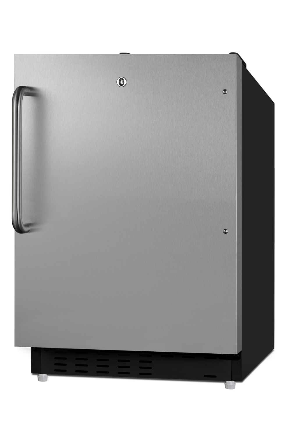 Summit Appliance offers a wide range of built-in undercounter refrigerator-freezers designed for installation under lower ADA compliant counters, with advanced features for user convenience.The ALRF49BSSTB is sized at 32 high to fit under lower counters complying with ADA guidelines for accessibility. The fully finished textured black cabinet allows freestanding use, while the front-breathing system means this unit can be built-in with minimum clearance. The stainless steel, user-reversible door is 3 thick for efficient insulation, with a curved towel bar handle included for added convenience. This unit comes with a right angle cord to allow for easier placement without added depth. A factory-installed lock is conveniently located towards the top of the door to provide security as needed. Inside, the ALRF49BSSTB features an all-white interior for easy cleaning and viewing of contents. Static manual defrost operation provides efficient cooling inside the 2.68 cu.ft. interior, while the dial thermostat makes temperature management simple. An automatic LED light located toward the front of the unit attractively illuminates the interior when the door opens. Three spill-proof adjustable glass shelves offer flexible storage options for large and small items, while a pull-out crisper drawer provides storage for fruits and vegetables. Three removable door racks accommodate additional storage as needed. This unit includes a compact freezer compartment with a cover. With its compact size and convenient features, the ALRF49BSSTB is the perfect unit for offices, dormitories, and other residential settings in need of an easy-fitting refrigerator-freezer.