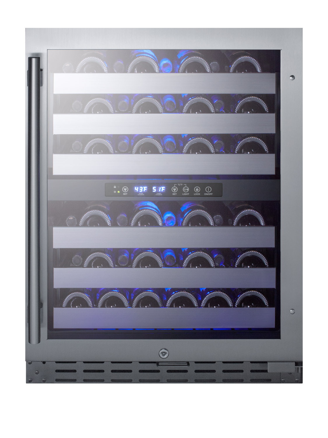 Summit's extensive selection of built-in undercounter wine cellars includes ADA compliant choices with versatile designs for residential or commercial use.The ALWC532 is a dual zone wine cellar that is ETL-S listed to NSF-7 commercial standards. The front-breathing design allows built-in installation, while the fully finished black cabinet also enables freestanding use. Sized just under 32 inches high and 24 inches wide, this unit makes an ideal fit under lower ADA compliant counters. The user-reversible double pane tempered glass door features a seamless stainless steel door trim and pro style handle in stainless steel. A factory-installed lock offers added security and a stainless steel kickplate completes the look.Inside, the ALWC532 is designed to store up to 46 standard Bordeaux style bottles, or a combination of 30 Bordeaux and 16 wider Burgundy bottles. The digital control panel allows you to manage the upper temperature chamber between 41 and 50ºF for white wine, while the lower zone is designed to store red wine between 50 and 64ºF. Six full-extension black wire shelves with stainless steel front trim move out smoothly on ball-bearing glides for easy loading. Both compartments include recessed LED lighting in a gentle blue hue for an attractive and efficient presentation.With its advanced user features and versatile design, the ALWC532 makes a great addition to any ADA compliant setting looking to store wine in modern style. This unit can also be ordered with a panel-ready door trim, or with a stainless steel wrapped exterior cabinet. For more options, browse our website.