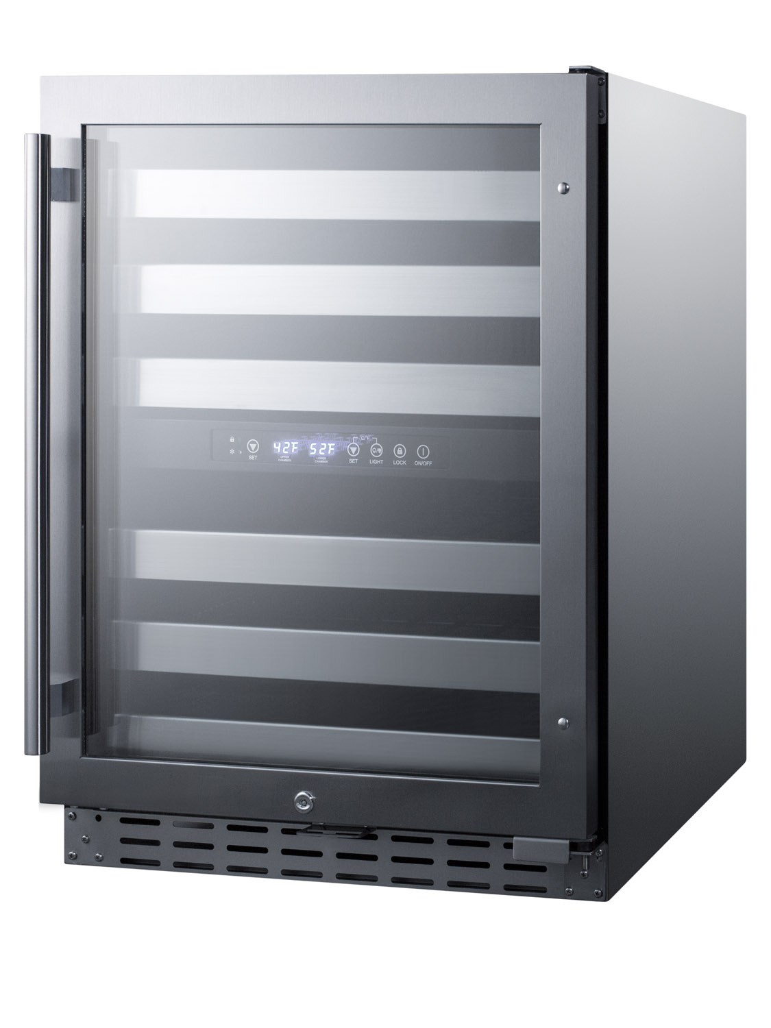 Summit's extensive selection of built-in undercounter wine cellars includes ADA compliant choices with versatile designs for residential or commercial use.The ALWC532CSS is a dual zone wine cellar that is ETL-S listed to NSF-7 commercial standards. The front-breathing design allows built-in installation, while the fully finished stainless steel wrapped cabinet also enables freestanding use. Sized just under 32 inches high and 24 inches wide, this unit makes an ideal fit under lower ADA compliant counters. The user-reversible double pane tempered glass door features a seamless stainless steel door trim and pro style handle in stainless steel. A factory-installed lock offers added security and a stainless steel kickplate completes the look.Inside, the ALWC532CSS is designed to store up to 46 standard Bordeaux style bottles, or a combination of 30 Bordeaux and 16 wider Burgundy bottles. The digital control panel allows you to manage the upper temperature chamber between 41 and 50ºF for white wine, while the lower zone is designed to store red wine between 50 and 64ºF. Six full-extension black wire shelves with stainless steel front trim move out smoothly on ball-bearing glides for easy loading. Both compartments include recessed LED lighting in a gentle blue hue for an attractive and efficient presentation.With its advanced user features and versatile design, the ALWC532CSS makes a great addition to any ADA compliant setting looking to store wine in modern style. This unit can be paired with the ALBV2466CSS for a matching set.