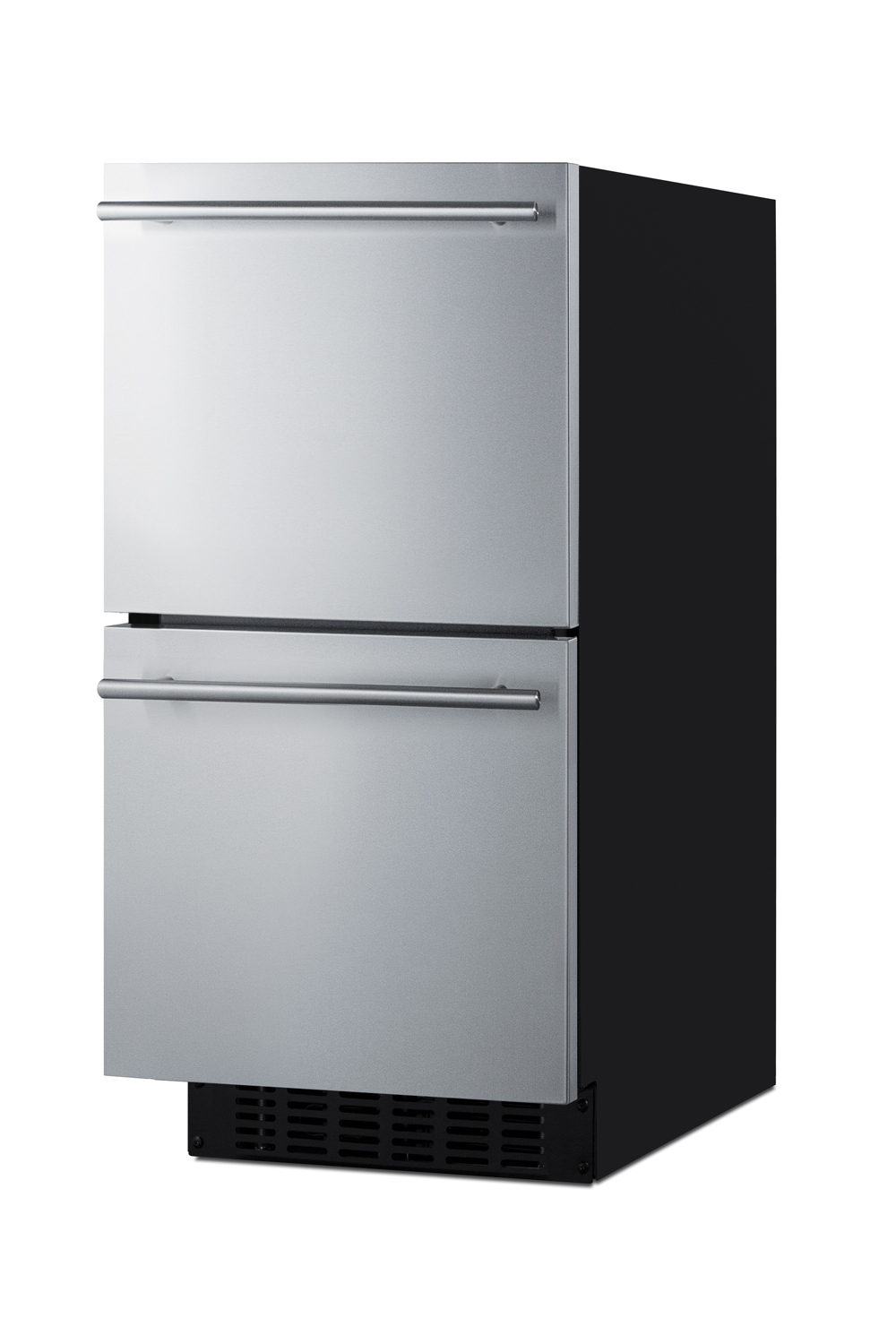 Summit's shallow depth series of built-in undercounter refrigeration brings full functionality to kitchen islands, wet bars, and other settings with space limitations.Model ASDR1524 is a 15" wide 2-drawer refrigerator sized under 18" deep. It comes in a 32" height to fit under lower ADA compliant counters, with adjustable legs and a sliding kickplate cover that also allows you to raise the overall height up to 34" to fit standard counter spaces. The front-breathing system allows built-in installation, while the fully finished black cabinet also allows freestanding use. This unit has a sealed rear and right angle cord for a better fit. The drawer fronts are fully finished in stainless steel, but can also accept panel overlays for a custom look (panel dimensions: 14.75" W x 14.1" H at 3/4" thick). Sleek stainless steel handles are included. Frost-free operation ensures minimal user maintenance, with fan-forced cooling to evenly distribute the temperature. A digital thermostat, located atop the upper drawer, makes it easy to manage the temperature, with an LED display that can be read in Celsius or Fahrenheit. Two removable dividers allow you to separate the drawer compartments for more versatile storage. White LED lighting makes it easy to view stored contents in the top drawer. A child lock will disable the digital controls after two minutes of inactivity to prevent accidental adjustments. Additional features include audible alarms for high-temperature fluctuations and open drawer alerts, a temporary memory function to recover all settings in the event of power loss, and sabbath mode to disable certain electrical features during periods of religious observance. The ASDR1524 refrigerator is ETL-S listed to NSF-7 commercial standards but can also be used in the home. With its deluxe style, user-friendly features, and uniquely shallow depth, this unit offers premium value for a variety of settings. Additional 18" deep choices are available in a variety of styles, includ