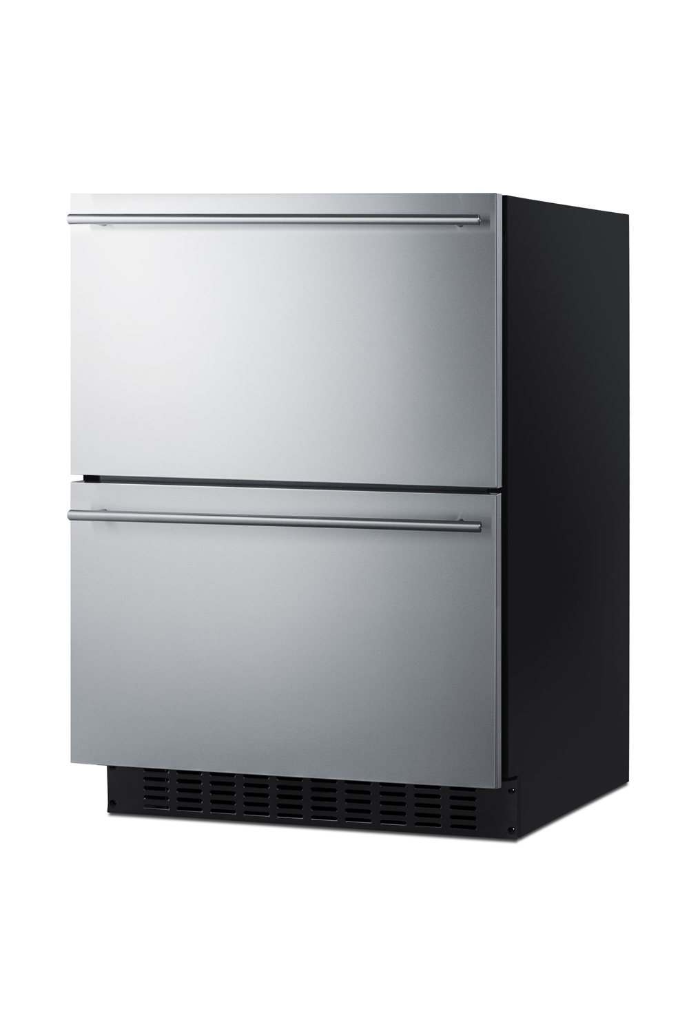 Summit's shallow depth series of built-in undercounter refrigeration brings full functionality to kitchen islands, wet bars, and other settings with space limitations.Model ASDR2414 is a 24" wide 2-drawer refrigerator sized under 18" deep. It comes in a 32" height to fit under lower ADA compliant counters, with adjustable legs and a sliding kickplate cover that also allows you to raise the overall height up to 34" to fit standard counter spaces. The front-breathing system allows built-in installation, while the fully finished black cabinet also allows freestanding use. This unit has a sealed rear and right angle cord for a better fit. The drawer fronts are fully finished in stainless steel, but can also accept panel overlays for a custom look (panel dimensions: 23.43" W x 14.1" H at 3/4" thick). Sleek stainless steel handles are included. Inside, the ASDR2414 has a generous 3.1 cu.ft. capacity to accommodate your storage needs. Frost-free operation ensures minimal user maintenance, with fan-forced cooling to evenly distribute the temperature. A digital thermostat, located atop the upper drawer, makes it easy to manage the temperature, with an LED display that can be read in Celsius or Fahrenheit. Two removable dividers allow you to separate the drawer compartments for easy organization. A child lock will disable the digital controls after two minutes of inactivity to prevent accidental adjustments. Additional features include audible alarms for high-temperature fluctuations and open drawer alerts, a temporary memory function to recover all settings in the event of power loss, and sabbath mode to disable certain electrical features during periods of religious observance. The ASDR2414 refrigerator is ETL-S listed to NSF-7 commercial standards but can also be used in the home. With its deluxe style, user-friendly features, and uniquely shallow depth, this unit offers premium value for a variety of settings. Additional 18" deep choices are available in a variety of styl