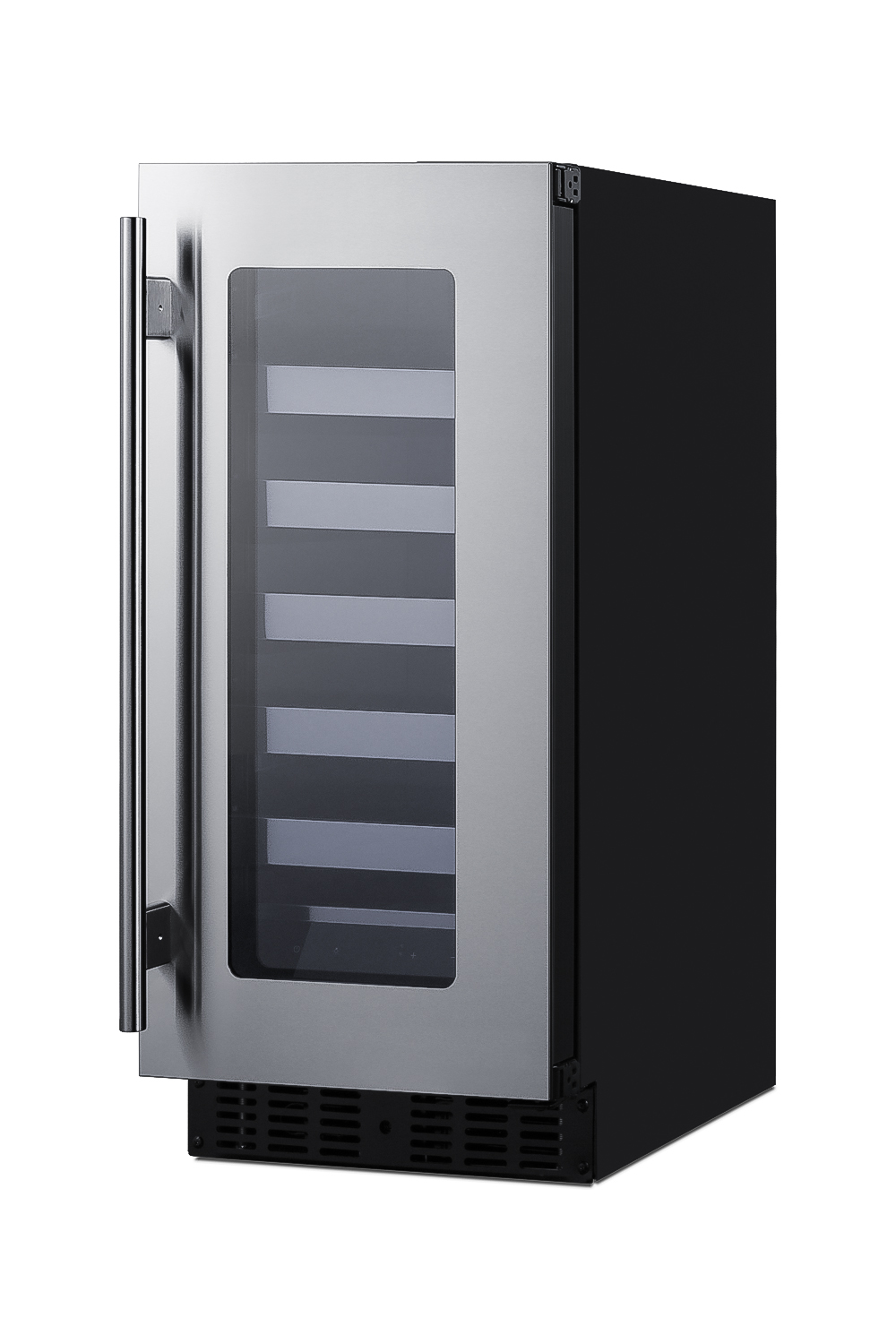 Summit's shallow depth series of built-in undercounter refrigeration brings full functionality to kitchen islands, wet bars, and other settings with space limitations.Model ASDW1522 is a 15" wide single zone wine cellar sized under 18" deep. It comes in a 32" height to fit under lower ADA compliant counters, with adjustable legs and a sliding kickplate cover that also allows you to raise the overall height up to 34" to fit standard counter spaces. The front-breathing system allows built-in installation, while the fully finished black cabinet also allows freestanding use. Seamless stainless steel trim blends smoothly into the double pane tempered glass door for an elevated look, with a professional stainless steel handle included. This unit has a sealed rear and right angle cord for a better fit. The door is user-reversible and includes a front lock to protect your collection.Inside, the ASDW1522 features stainless steel construction for improved durability and sanitation. White LED lighting located in the side walls provides elegant display conditions, with dimmable levels that let you create the perfect presentation. The digital control panel lets you adjust the temperature between 41º and 64ºF to accommodate red, white, or sparkling wine. Store bottles on the removable steel shelves complete with stainless steel front trim. Fan-forced cooling ensures even temperature distribution and fast temperature recovery. Additional features include an open door alarm, high temperature alarm, and Sabbath mode setting that lets you disable some of the electrical elements during periods of observance.The ASDW1522 is ETL-S listed to NSF-7 commercial standards but can also be used in the home. With its deluxe style, user-friendly features, and uniquely shallow depth, this unit offers premium value for a variety of settings. Create a matching set by pairing this with our ASDG1521 beverage center. Additional 18" deep choices are available in 15", 19", and 24" widths, including outd