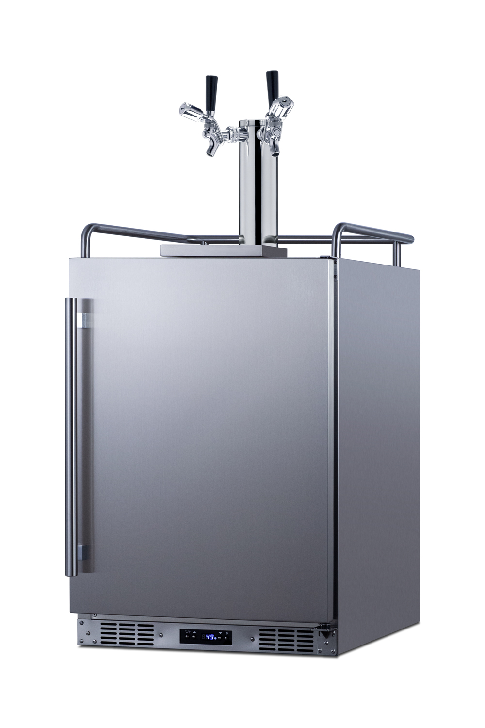 Summit manufactures a complete line of built-in kegerators designed for indoor/outdoor use in commercial settings.The BC74OSCOMTWIN is a full-size kegerator designed for dispensing beer on tap. It is ETL-S listed to NSF-7 and meets UL-471 standards for use in commercial establishments. Sized at just 24" wide, it features a weatherproof 304 grade exterior for long-lasting durability safe for use in outdoor settings. The front-breathing system allows built-in installation, while the fully finished cabinet and included caster set make for easy freestanding, portable use. This unit features a user-reversible stainless steel door with a pro style vertically mounted handle. The sealed back allows for easy cleaning of the unit. Additional features include a removable two-piece stainless steel drip tray to collect spills and a chrome guard rail to help keep glasses and mugs in place. For added security, we include Summit's TapLock, a removable lock that allows you to secure the tap faucet as needed to prevent unsupervised access to the kegerator contents.Inside, the 5.6 cu.ft. interior can accommodate a full half or slim quarter keg, or up to three Cornelius or sixth barrel kegs. We include a complete commercial grade dual tap kit for dispensing your favorite beer, including a Sankey tap system and twin tap draft tower, along with a CO2 tank and regulator. A tap cool system keeps your beer cold as it goes through your tower, and a Velcro strap holds the CO2 tank in place. The interior floor is made from stainless steel to add protection when loading and removing kegs. Two chrome shelves, with six placement options, allow the kegerator to also function as a beverage refrigerator. A digital thermostat makes it easy to manage the wide range temperature, while the external digital display has a readout in Celsius or Fahrenheit. Automatic defrost operation ensures minimal user maintenance. The Memory IC function recovers the unit's last settings in the case of a power outage or