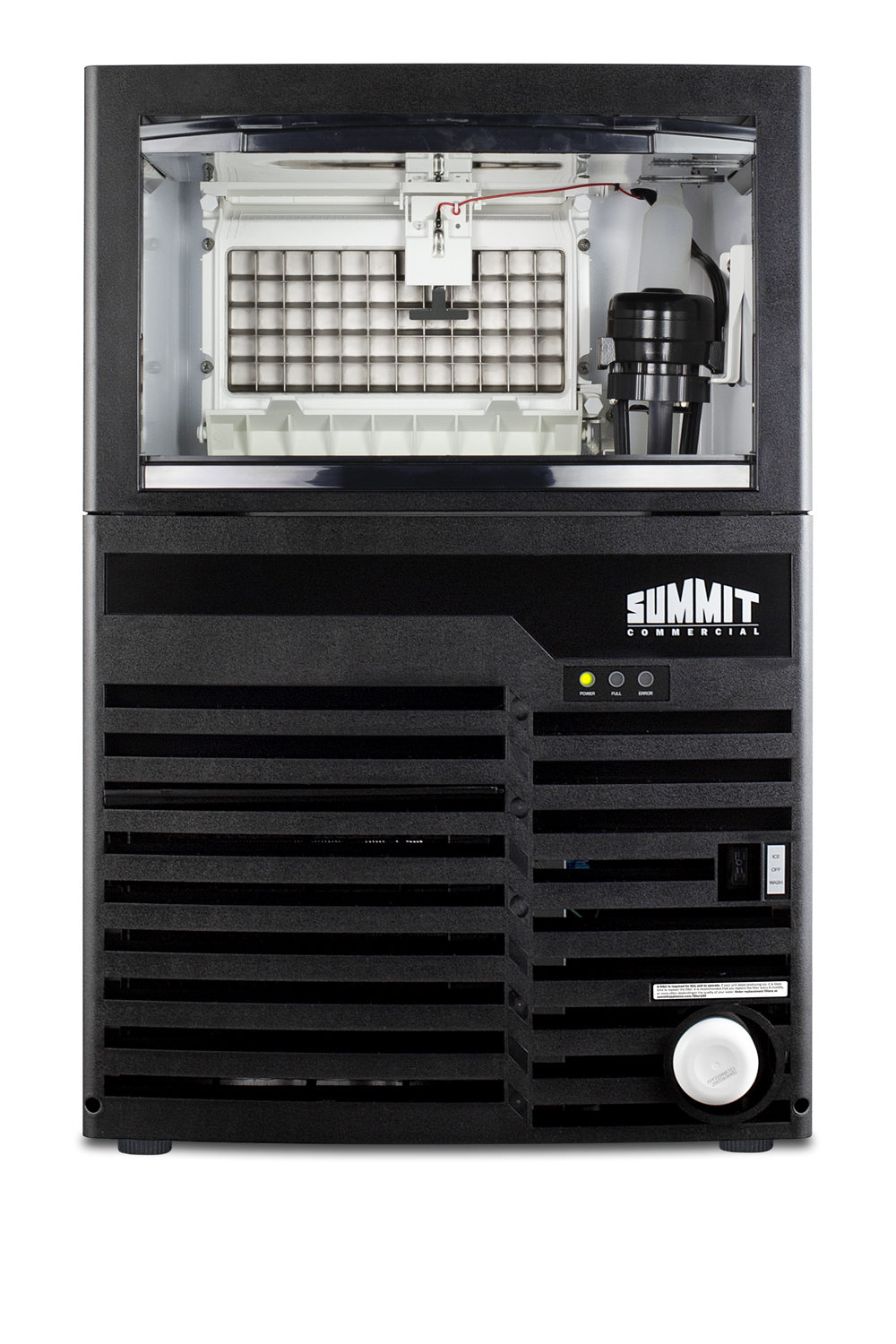 Summit Commercial brings powerful performance and user-friendly convenience in an under the counter design with the BIM100ADA commercially approved icemaker, specially designed to fit in ADA compliant settings.Made for Summit in South Korea, the BIM100ADA is ETL-S listed to NSF-12 standards for use in commercial applications.This unit features a fully finished stainless steel cabinet and jet black front with a slide-up lid. It can be built-in under counters or used freestanding, with a front-breathing air-cooled system to prevent overheating. The BIM100 produces up to 100 lbs. of clear dice style ice cubes per day. The interior can store up to 27 lbs. to help meet the needs of high traffic commercial environments, with an automatic sensor to prevent overproduction. This unit has a 30" high cabinet and ships two sets of leveling legs: adjustable .5" to 1.5" legs that raises the height up to 31.5" for use under lower ADA compliant counters, and a standard set of 4.5" high commercial legs for a more traditional 34.5" counter height. All controls are conveniently located in front, with a removable mesh filter to make it easy to remove dust buildup from affecting the condenser. We also include an ice scoop for serving convenience. The BIM100ADA is designed to operate quietly. It comes equipped with an internal wash setting for simple maintenance, and a 7.5" long power cord for flexible placement. This unit has a sealed back in stainless steel for added space savings and easier cleanup. It utilizes a gravity drain system and requires professional installation (drain size: 3/4"; water supply/inlet size: 3/8").The BIM100ADA ships with an included water purification filter to ensure better tasting ice. This filter is required in order to operate the unit and will need to be replaced every six months (timing may vary based on the quality of your water). To order a replacement set, visit summitappliance.com/filter100.With its high capacity output and slim-fitting design, the B
