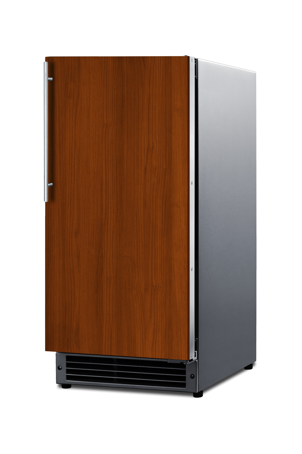 Summit combines convenience and luxury to craft the BIM26H32IF - an undercounter icemaker finished in complete 304-grade stainless steel.Sized at just under 15" wide, the BIM26H32IF features a front-breathing design for built-in installation but also has a fully finished cabinet to allow freestanding use. With a height just under 32", Summit designed this icemaker to be compatible with ADA-compliant counters. This unit can be raised to 34". A taller kickplate is included for a streamlined and cohesive look.This model features a panel-ready door with an integrated stainless steel frame that lets you install an overlay panel and handle to match or complement surrounding cabinetry (recommended panel dimensions: 27 9/16" H x 14 13/16" W at 3/4" thick). The sealed back design allows more flush installation. An optional water filter is included and designed to be mounted in the rear.A look inside the BIM26H32IF shows it can produce 25 lbs of crescent-shaped ice daily. The static manual defrost cooling system allows ice to stay solid longer. No drain or pump is required, offering more placement flexibility. For optimal convenience, Summit has pre-installed the connection hose. Plus, this icemaker comes with a removable ice bucket, ice scoop, and a holder for the scoop. With its customizable exterior, stainless steel cabinet, and low maintenance design, the BIM26H32IF drain-free icemaker is a great way to finish any undercounter kitchen space and allows you to maintain an entire supply of ice with less waste. This icemaker is an ADA-compliant model. Alternative units are also available in different sizes, colors, and makes. Browse the full Summit product line to explore your options.