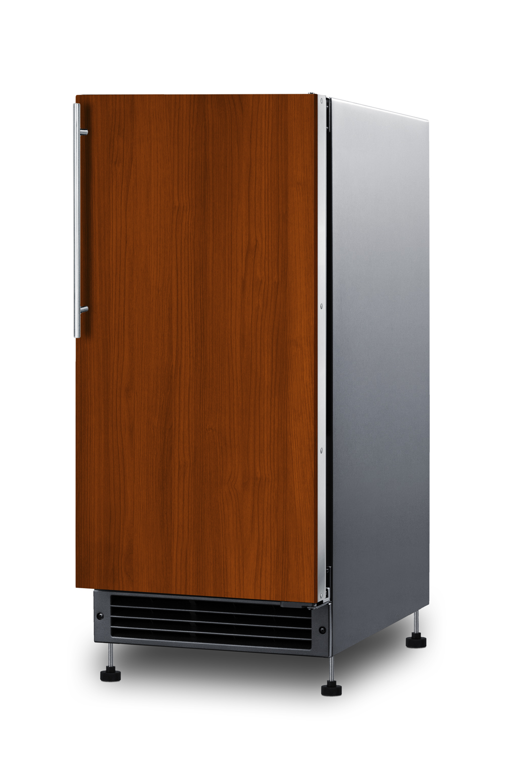 Summit combines convenience and luxury to craft the BIM26H34IF - an undercounter icemaker finished in complete 304-grade stainless steel.Sized at just under 15" wide, the BIM26H34IF features a front-breathing design for built-in installation but also has a fully finished cabinet to allow freestanding use. With a height of 34", Summit designed this icemaker to be compatible with standard counters. This unit can be lowered just under 32" to fit ADA-compliant spaces. A smaller kickplate is included for a streamlined and cohesive look.This model features a panel-ready door with an integrated stainless steel frame that lets you install your own overlay panel and handle to match or complement surrounding cabinetry (recommended panel dimensions: 27 9/16" H x 14 13/16" W at 3/4" thick). The sealed back design allows more flush installation. An optional water filter is included and designed to be mounted in the rear.A look inside the BIM26H34IF shows it can produce 25 lbs of crescent-shaped ice daily. The static manual defrost cooling system allows ice to stay solid longer. No drain or pump is required, offering more placement flexibility. For optimal convenience, Summit has pre-installed the connection hose. Plus, this icemaker comes with a removable ice bucket, ice scoop, and a holder for the scoop. With its customizable exterior, stainless steel cabinet, and low maintenance design, the BIM26H34IF drain-free icemaker is a great way to finish any undercounter kitchen space and allows you to maintain an entire supply of ice with less waste.