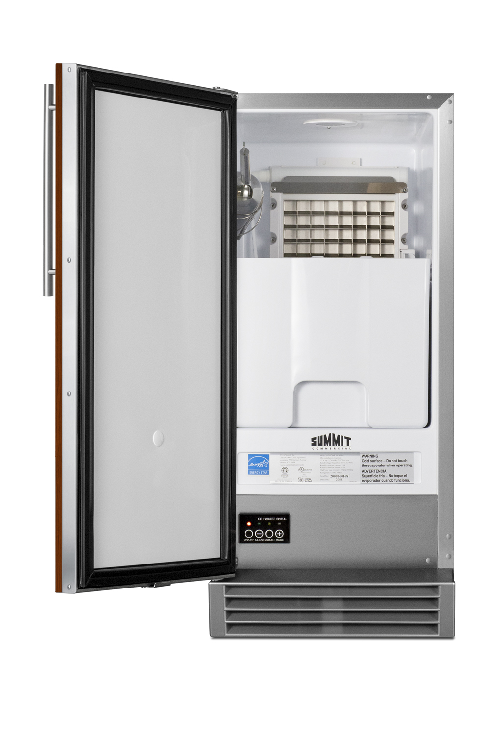 Summit's commercially approved icemakers are an attractive and durable solution to keeping a continuous supply of clear ice on hand in virtually any kitchen space.ENERGY STAR certified for commercial use, BIM44GCSSIFADA is just 32 3/8"high, ideal for use under lower counters following ADA compliant guidelines. It features a complete stainless steel exterior for added durability and long-term use. The front-breathing design allows built-in use under counters, while the fully finished stainless steel cabinet also allows freestanding use, with a sealed back for easier cleanup. The door features an integrated stainless steel frame designed to accept full panel overlays, allowing users to seamlessly blend the unit into their own cabinetry design (panel size: 27 7/8" Hx14 5/8" W and at least 3/4" thick; maximum weight: 10 lbs.). Customers provide their own handle to complete the look.Inside, the BIM44GCSSIFADA has a touch control panel for easy operation. Indicator lights alert users to each step in the production process, as well as to when the bin is full. This unit can produce up to 50 lbs. of clear cube-shaped ice, with an adjustable bin capacity that can hold up to 25 lbs. The ice is produced in sheets and can easily be broken into cubes with the provided stainless steel scoop, which can be mounted on brackets inside for easy use. An interior light in a blue hue allows for easy viewing of the interior, while automatic defrost operation makes maintenance simple and stress-free. This model comes equipped with an internal pump, while four adjustable leveling legs keep the unit level on uneven surfaces. Sized at 15" wide, BIM44GCSSIFADA is ETL-S listed to NSF-12 for use in foodservice settings and can also be installed in any kitchen or wet bar. For this unit in a standard height, see the BIM44GCSSIF.