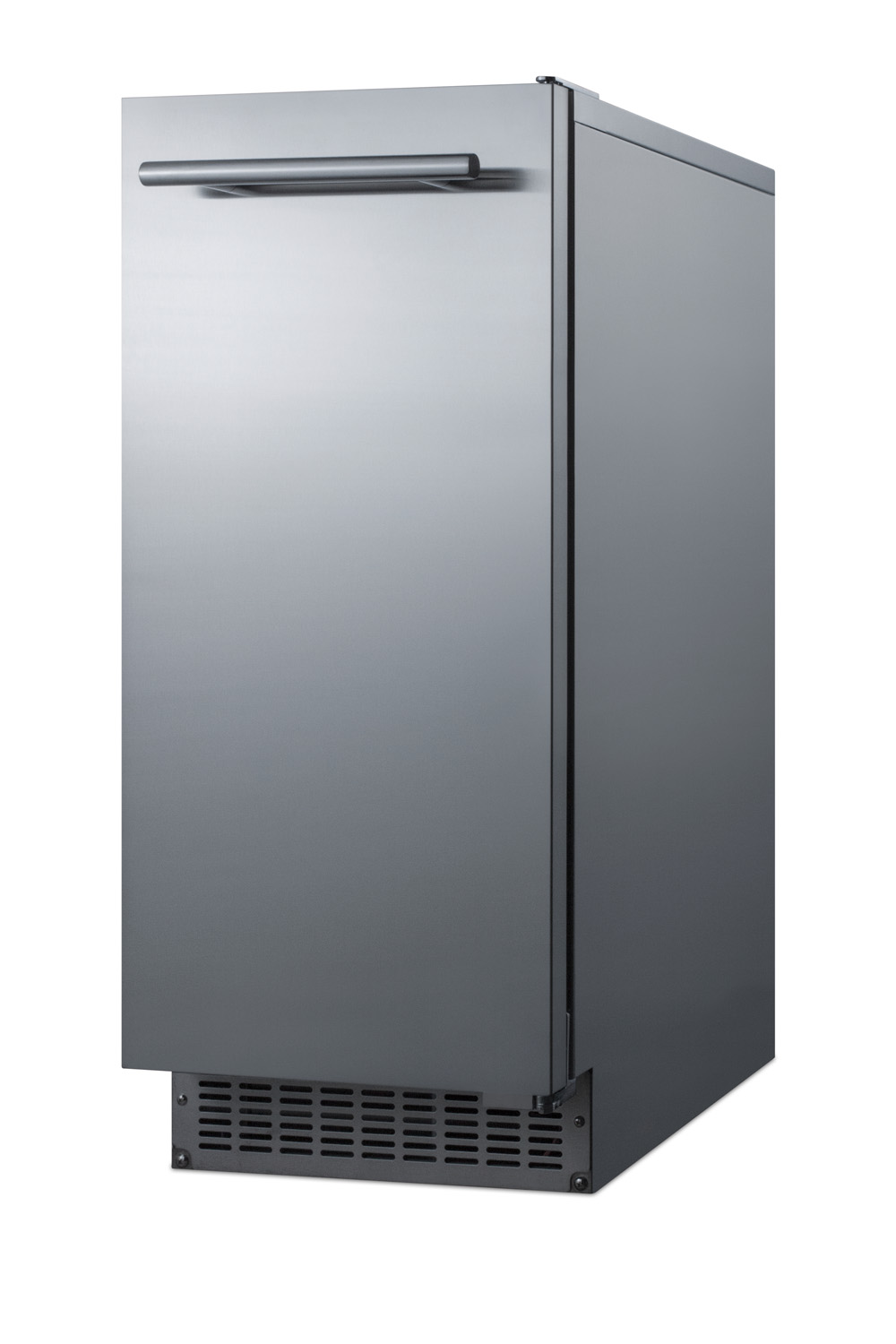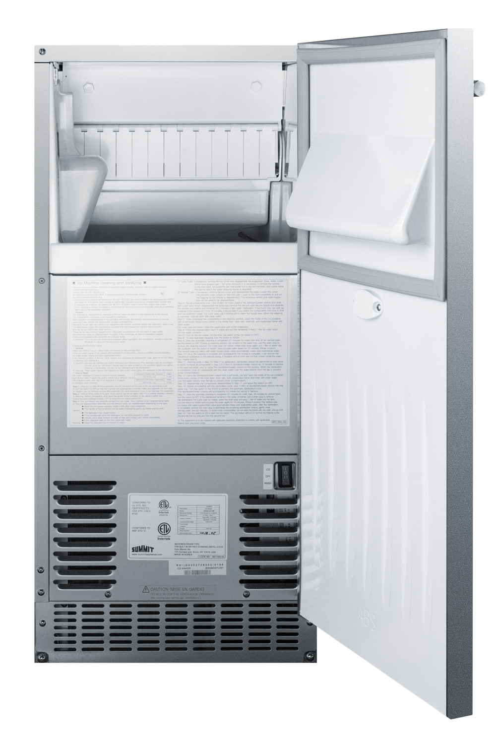 Summit's commercially listed BIM68OS series icemakers are an attractive and durable solution to keeping a continuous supply of clear ice on hand in virtually any indoor or outdoor location.Sized at 15" wide, the BIM68OSGDR features a complete 304 grade stainless steel exterior specially built to hold up to the elements. The user-reversible door is designed with a powerful magnetic gasket to ensure proper insulation, with a stainless steel handle mounted horizontally for a modern look. The front-breathing design allows built-in installation under counters, while the fully finished stainless steel cabinet also allows freestanding use, with a sealed back for added outdoor protection and easier cleanup. This model utilizes a gravity drain system.The BIM68OSGDR produces clear gourmet dice-style ice cubes, perfect for keeping any beverage cold without diluting the flavor. Under standard operating conditions, this unit can make up to 47 lbs. in a day cycle, while the storage bin can hold up to 26 lbs at a time. We include an ice scoop that can be hung inside for easy use. Frost-free operation eliminates the need to defrost the interior.Designed and manufactured for us in South Korea, the BIM68OSGDR is UL-S listed to NSF-12 commercial standards for use in foodservice settings. The weatherproof constructed allows outdoor use, but this model can also be installed indoors in any kitchen or wet bar. A panel-ready version (BIM68OSGDRIF) will be available later this year.NOTE: This unit requires professional installation. Drain hose and other connection equipment is not included.