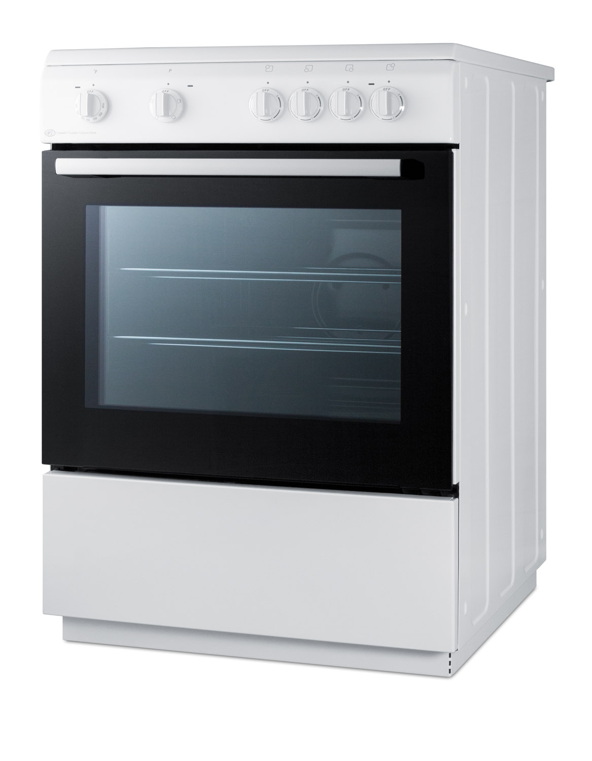 The Summit Classic Collection features deluxe appliances designed to bring modern luxury into the home.Made in Europe, the CLRE24WH is a 24" wide 220V electric range with a smooth Schott ceramic glass surface for safer heating with easy cleanup. Two 7.5" burners and two 6" burners accommodate a variety of cookware sizes. All push-to-turn cooking controls are located upfront, eliminating the danger of reaching across the cooktop surface. Indicator lights illuminate when the burners and oven are on for added kitchen safety. This unit features a 'slide-in' look without a backguard, ideal for integrating the stove into your own wall or backsplash design.The large oven window provides a full view of your cooking, with an interior light that automatically turns on with the oven. The oven door is constructed from sleek black glass for a modern look, with a clean white finish on the cabinet, storage drawer, and manifold. Inside, the 2.4 cu.ft. interior includes two sliding wire racks with five positions to let you fit various dish sizes. Cooking settings include a low and high broil option, as well as a bottom heat function ideal for certain applications. This unit's accessible design meets ADA guidelines. With its elegant design and user-friendly features, the CLRE24WH makes a stunning addition to any home kitchen.