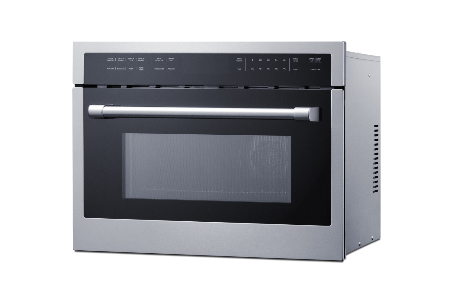 Summit helps enhance smaller kitchen functionality with fully featured speed ovens. Designed for built-in installation, the CMV115 meets all of your cooking needs in just 24" of width. This unit can be installed in 17 3/4" H x 22 5/16" W x 22" D wall cavities and under counter openings to maximize kitchen space. It includes a pre-installed cord with a 3-prong NEMA 5-20 plug for easy installation in 115V connections. The CMV115's exterior features sleek stainless steel with a horizontal grain and a modern design with a matching handle. The double-pane tempered glass door comes with an attractive tint and jet black trim to match the digital touch control panel.Inside, this speed oven offers a generous 1.55 cu.ft. capacity. The interior walls are constructed from stainless steel to ensure easier cleaning and lasting durability. We include an adjustable wire oven rack, ceramic round baking tray, and removable metal turntable for easy microwave use.Enjoy uncomplicated cooking to achieve the exact taste, texture, and, more importantly, temperature you want for your dishes. Settings include bake, high/low broil, and convection heating. The rapid preheat function saves cooking time and features an audible alert when the set temperature has been reached. The microwave functionality includes a +30 seconds button, as well as one-touch settings for popcorn, beverages, frozen foods, and pizza, as well as sensor heating and auto defrost by time or weight. 10 power settings let you find the right level of heat for every dish. Multi-stage cooking allows you to set two power levels when needed. With its ideal size, modern style, and advanced technology, the CMV115 is the perfect solution for bringing full-service cooking convenience to apartments, senior living facilities, mobile homes, and other kitchens with space and power limitations.For a 240V version, see model CMV24. In addition to our innovative speed ovens, we offer built-in, drawer-style, and countertop microwaves in an ar