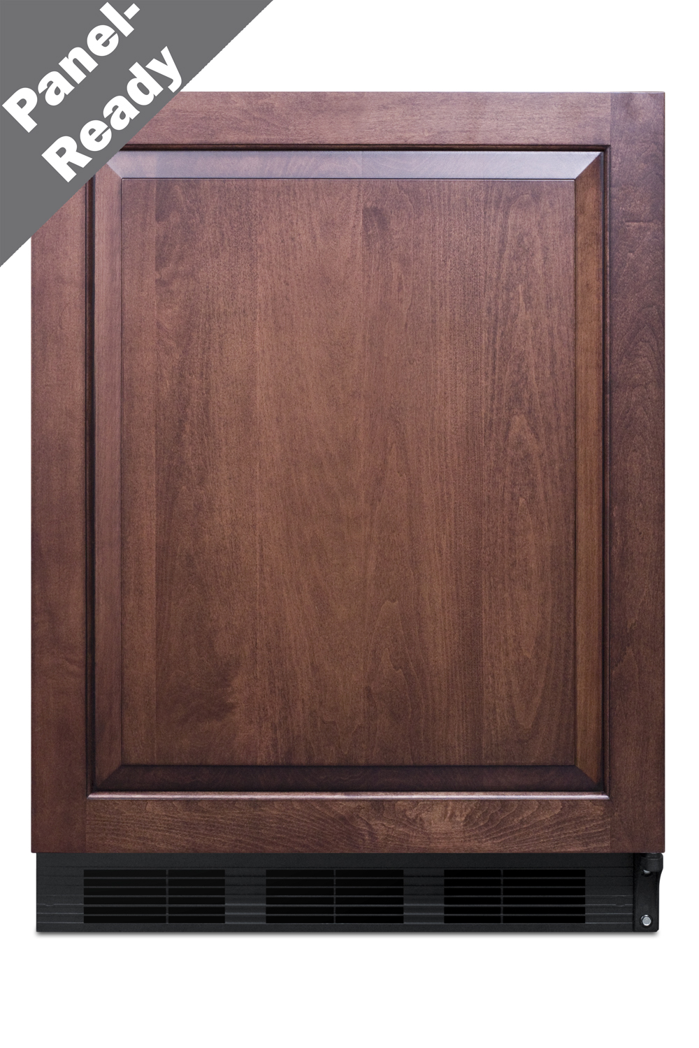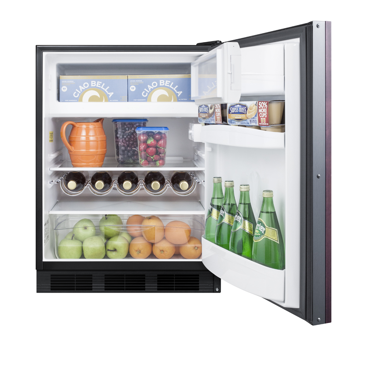 Summit's Peak24 series of undercounter European-made refrigeration features energy efficient, ADA height choices that offer the largest capacity in the industry for recessed installation in 24 openings.Sized with a 24” footprint, the ENERGY STAR certified CT663BKIFrefrigerator-freezer offer a generous 5 cu.ft. storage capacity, larger than many units in this size class. This unit comes in a black exterior finish. The integrated stainless steel door frame is designed to accept overlay panels (sized 23 5/16 W x 28 1/4 H), allowing you to customize the front to seamlessly match your own cabinetry style. Customers provide their own handle.Inside, the CT663BKIF features a dual evaporator to allow separated cooling of the fresh and frozen food sections. The refrigerated compartment utilizes low maintenance automatic defrost, while the interior freezer compartment is manual defrost to achieve lower storage temperatures ideal for ice cream and other frozen food. The deluxe interior includes adjustable glass shelves for spill-proof storage and easier cleaning, as well as a scalloped wine shelf to hold wine and champagne bottles safely in place. Door racks offer additional convenience for tall bottles and condiments and a clear crisper drawer ensures your produce is stored under the ideal conditions. This model includes automatic interior lighting and an adjustable dial thermostat.The CT663BKIF is UL listed for residential use. With its large capacity and user-friendly features, this unit is a convenient option for homes, offices, schools, and other settings in need of reliable cold storage. Additional choices are available in ADA compliant height. Browse the full Summit catalog to discover the perfect appliance for your refrigeration needs.