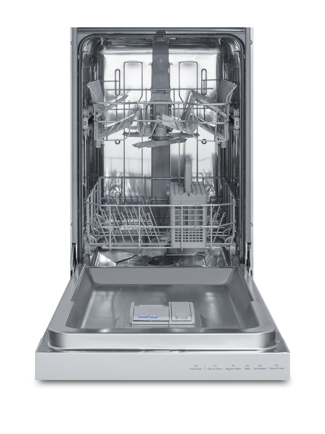 Summit's selection of European dishwashers are carefully designed and constructed for the optimum customer experience, with ENERGY STAR certified performance and user-friendly features.Sized at just 18 inches wide, the DW18SS4 is a built-in dishwasher with an adjustable height from 33.5" to 34.25" that allows you to get the perfect fit under the counter. We include multiple kickplates to accommodate different height settings. The stainless steel door features an attractive horizontal grain. This unit includes a pre-installed power cord with a 3-pronged plug. The front control panel ensures intuitive operation, with large touch buttons and an easy-to-read key printed on the top panel. Wash programs include a heavy duty cycle for pots and pans, a regular wash function, Rinse & Hold, self-clean cycle, a 58-minute Quick & Dry setting, and Quick Wash for smaller loads that can be cleaned in 35 minutes. You can also specify a half load, extra rinse, extra drying, or rapid cleaning. Automatic detergent detection allows the dishwasher to sense the type of detergent in use, adjusting the washing program and drying system for the best performance. A time delay function allows you to program your wash cycles up to 24 hours in advance to best suit your schedule. The screen will also display indicators for softening salt, rinse aid, water cutoff, and overflow.Inside, the DW18SS4 features a stainless steel interior for lasting durability. Quality insulation helps to ensure a quiet 49 db performance. This unit features two slide-out racks to wash up to 8 place settings. The upper rack is best suited for cups and other lighter items, with adjustable side tines that make it easier to accommodate tall glasses or to stack smaller mugs. The lower rack is ideal for plates, pots, and other heavier soiled items. A removable cutlery basket with six sections makes it easy to keep your utensils together for quicker storage after a wash.With its efficient performance and convenient programs,