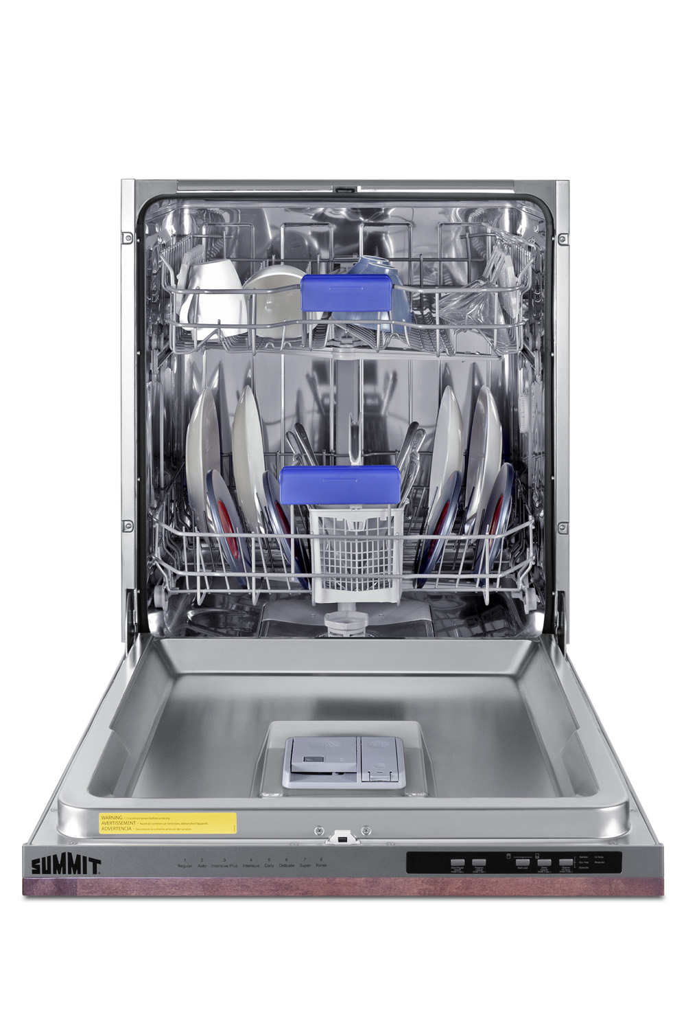 Summit's European dishwashers offer true efficiency for the home, with ENERGY STAR certified performances and ultra quiet operation.Model DW245NTADA is a 24" wide dishwasher sized at 32.25" high for an easy fit under lower ADA compliant counters. The leveling legs allow you to raise the height up to 34". We include an extra kickplate that covers the front for a cleaner look and to help prevent dirt from going under the unit. This is a fully integrated dishwasher with an unfinished door designed to accept user-provided panels to create a seamless look that blends into your cabinetry. Users also provide their own handle. The control panel is located on top of the door to help ensure a seamless look with your kitchen. Advanced sound absorption ensures a quiet performance at just 47 dB. This unit offers eight wash programs to accommodate all of your cleaning needs, from an "intensive plus" setting for tough stains to a delicate function to safely handle fragile items. Five auxiliary functions let you further customize the wash and dry settings, with options that include sanitize, extra fast, extra dry, high temperature, and half load for added efficiency. The control panel features easy touch buttons and a digital display for intuitive operation. Additional features include a pause function, 19-hour delay start option, and indicators for rinse aid, water cutoff, and overflow.Inside, the DW245NTADA features stainless steel construction for true durability. Two spray arms help to ensure your full load is thoroughly washed. The upper slide-out rack can be set in two positions, allowing you to adjust the setup if washing particularly tall items. Side flaps can be used to stack smaller cups, keep glasses in place, or hold long utensils. The lower rack includes two fold-down tines that let you better accommodate oversized pots as needed. We include a removable cutlery basket to make it easier to load and unload silverware.In addition to this dishwasher, Summit offers more cho