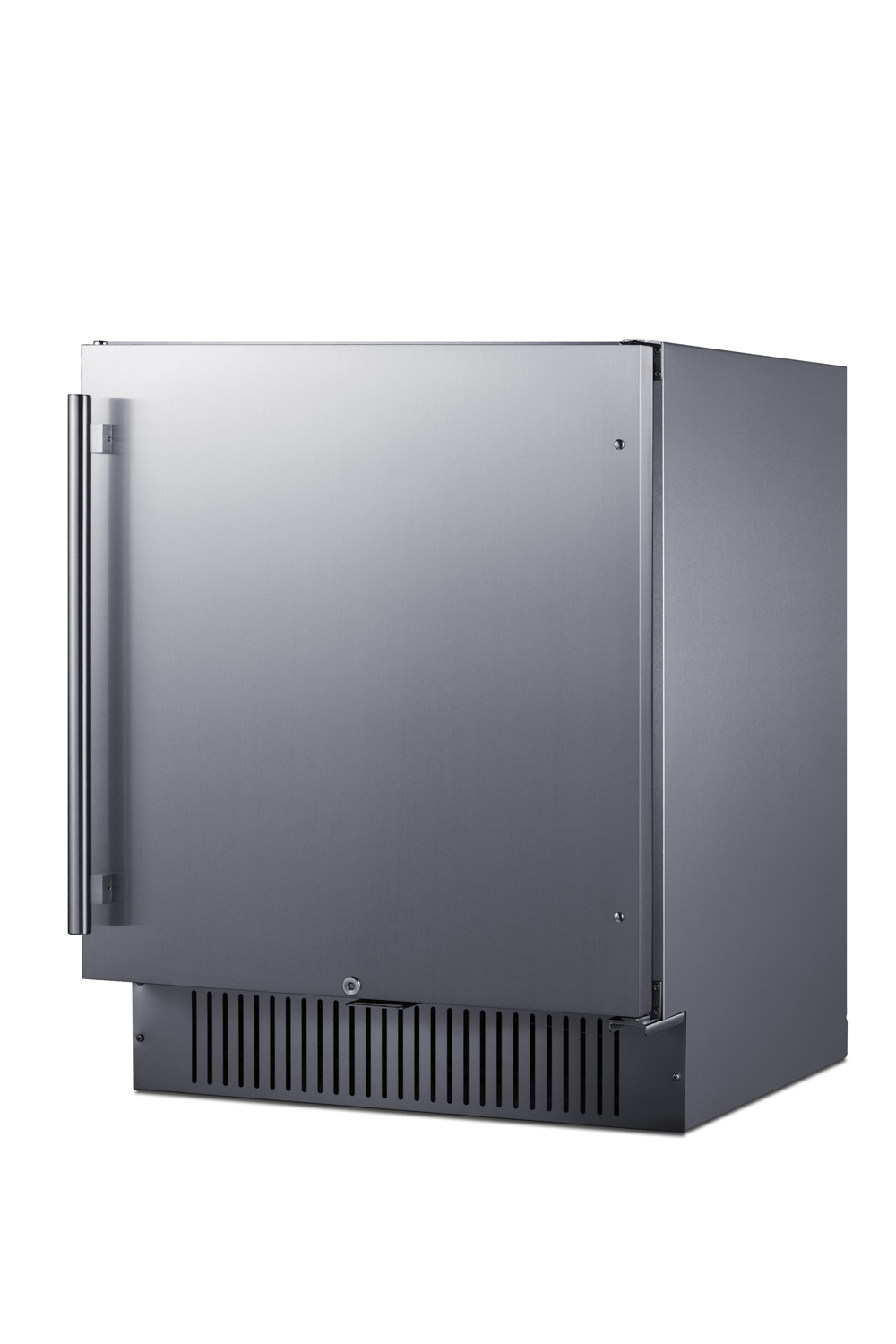 Summit is expanding its popular lineup of built-in undercounter refrigeration with new luxury choices for 27" wide spaces in residential or commercial kitchen spaces. Model FF27BSS is an all-refrigerator sized just under 27" wide and under 24" deep for an easy fit under the counter in any kitchen with limited depth. The front-breathing design allows built-in installation, while the fully finished black cabinet also enables freestanding use. The user-reversible door comes in a stainless steel finish with a vertical grain and a pro style handle. This unit has an integrated flat door hinge in stainless steel that does not add any additional height. The sealed back and right angle plug help to ensure an easy fit. We include a factory-installed lock on the door and two keys for optional security as needed.The refrigerator interior comes in a clean white finish, perfect for providing full visibility. The LED lighting can be adjusted between three levels of brightness to best suit your preferences. Additional features include a 96-hour Sabbath mode setting, high/low temperature alarm, and a child lock to secure the digital control panel. Adjustable chrome shelves make it easy to rearrange the interior as needed for the optimum storage. The door includes two racks ideal for holding condiments and the floor is slotted to keep bottles in place. The FF27BSS is ETL-S listed to NSF-7 commercial standards and is also approved for residential use. The weatherproof construction allows use in indoor or outdoor kitchens. Additional 27" wide choices are available in drawer style (SPR275OS2D) and ADA height (FF27BSSADA), with more options available soon. For this unit with a set of four commercial casters, see the FF27BSSCAS.