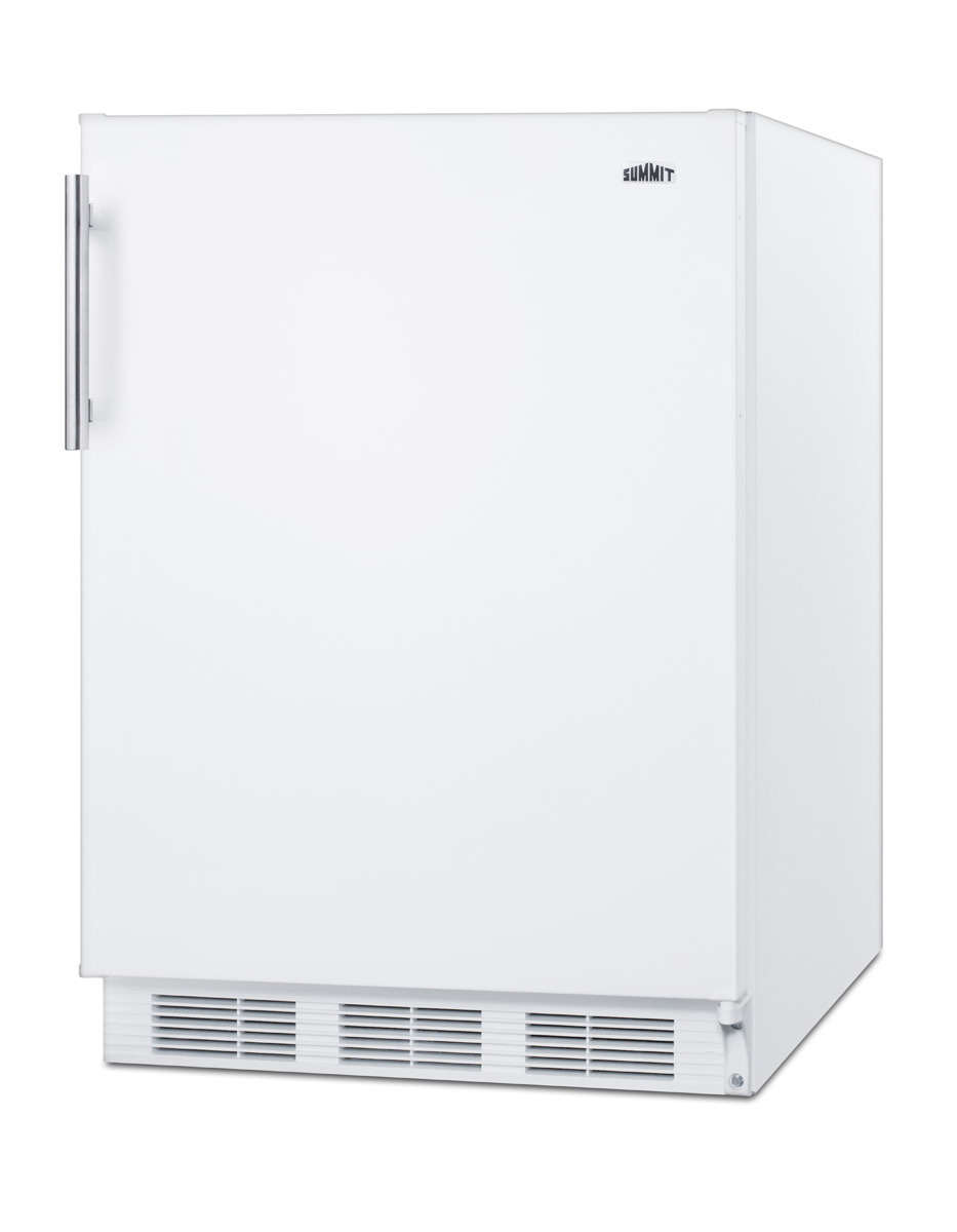 Summit's Peak24 series of undercounter European-made refrigeration features energy efficient, ADA height choices that offer the largest capacity in the industry.Sized with a 24" footprint and 32" height, model FF61WADA is an ENERGY STAR certified all-refrigerator designed for residential use, with a lower height ideal for ADA compliant settings. It comes in a clean white finish with a side-mounted stainless steel handle for an easy grip and attractive look. The user-reversible door lets you accommodate any space.With a full 5.8 cu.ft. interior, the Peak24 series offers a higher storage capacity than other counter height units in the market. Inside, the FF61WADA utilizes automatic defrost operation to ensure minimum user maintenance. The 5.8 cu.ft. interior offers more storage space than most models in this size class. Adjustable glass shelves ensure spill-proof storage, while a large crisper drawer is ideal for keeping produce at its best. A removable wine shelf lets you keep bottles securely in place. The door includes three storage racks for condiments and tall bottles. The seamless interior also features a dial thermostat and automatic light.The FF61WADA is UL listed for residential use. With its large capacity and user-friendly features, this freezerless refrigerator is a convenient option for homes, offices, schools, and other settings in need of reliable cold storage. Additional choices are available in standard counter height, as well as with freezer compartments (model CT661WADA). Browse the full Summit catalog to discover the perfect appliance for your refrigeration needs.