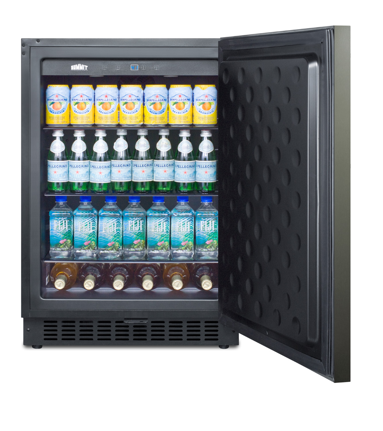SUMMIT's FF64B Series brings quality and convenience under the counter with a fully featured lineup of built-in all-refrigerators.Sized with a convenient 24" footprint, the FF64BXKSHH refrigerator utilizes a front-breathing design for built-in installation under counters, with a fully finished black cabinet that also allows freestanding use. This model's door comes in our new black stainless steel finish from our exclusive basalt collection. The wrapped door is made from 304 grade stainless steel with a high gloss finish in a neutral hue to perfectly accent or complement your kitchen design. The door is strongly resistant to most fingerprints and can easily be wiped clean with a dry cloth. Our signature thin handle in brushed stainless steel is mounted horizontally to complete the modern look.Inside, the FF64BXKSHH utilizes frost-free operation with fan-forced cooling to ensure low maintenance and even temperature distribution. Recessed LED lighting offers an attractive yet efficient look. The digital thermostat makes it easy to manage the interior temperature. This unit includes adjustable glass shelves for flexible and spill-proof storage. The floor is specially slotted to hold bottles in place. Additional features include an open door alarm, high temperature alarm, and Sabbath mode setting that lets you disable some of the electrical elements during periods of observance.The FF64BXKSHH refrigerator is ETL-S listed to NSF-7 commercial standards and is ENERGY STAR certified as a commercial refrigerator. It also meets DOE standards for residential applications, using 20% less energy than the maximum allowed for this product class and capacity. With its deluxe style and user-friendly features, this unit is the perfect choice for home or commercial kitchens. For a matching frost-free all-freezer, see the SCFF53BXKSHH.NOTE: Black stainless steel may vary slightly in appearance from the image displayed, as it has a reflective quality that can be affected by surrounding