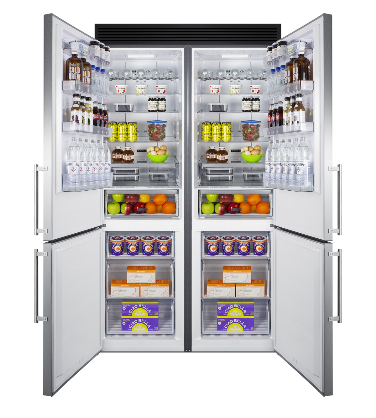 Bring European luxury to small kitchen spaces with Summit's premium counter depth bottom freezer refrigerators, available now to fill traditional 84" H x 48" W kitchen spaces.Model FFBF181ES2KIT48 combines two of our ENERGY STAR certified European bottom freezer refrigerators, both sized under 24" deep for an easy fit in shallow spaced kitchens. We ship one unit with a right hand door swing and the other with a left hand door swing, allowing you to create a French door effect for an efficient use of kitchen space. Both units feature stainless steel doors with a gentle curve and pro style handles to complete the look. We include our GRILL48B, a cosmetic top grill in black powder-coated steel to help fill standard 84" high kitchen openings. The included 6' Y-shaped NEMA 5-15P cord with a 3-prong right angle plug allows users to operate both units from one outlet without added depth. Each unit offers 11.7 cu.ft. of storage capacity to bring the overall interiors to 23.4 cu.ft. The bottom freezers include three slide-out storage drawers with clear plastic fronts, ensuring stored items are protected when the doors are open. The fresh food compartments come fully featured with adjustable glass shelves, scalloped steel bottle racks, removable door storage, large crispers, and a FreshZone deli drawer that can hold colder temperatures for meat or be converted to regular crisper conditions with an easy slide dial. Digital controls ensure easy use for both compartments, with audible temperature and open door alarms to help protect your groceries. This refrigerator is designed with AdaptTech, adaptive intelligent technology that adjusts the cooling to your habits based on the frequency of door openings. Additional features include a fast freeze setting (ideal for loading groceries) and an eco setting. SKU FFBF181ES2KIT48 ships on one pallet with the three pieces (FFBF181ES2, FFBF181ES2LHD, and GRILL48B) individually boxed.