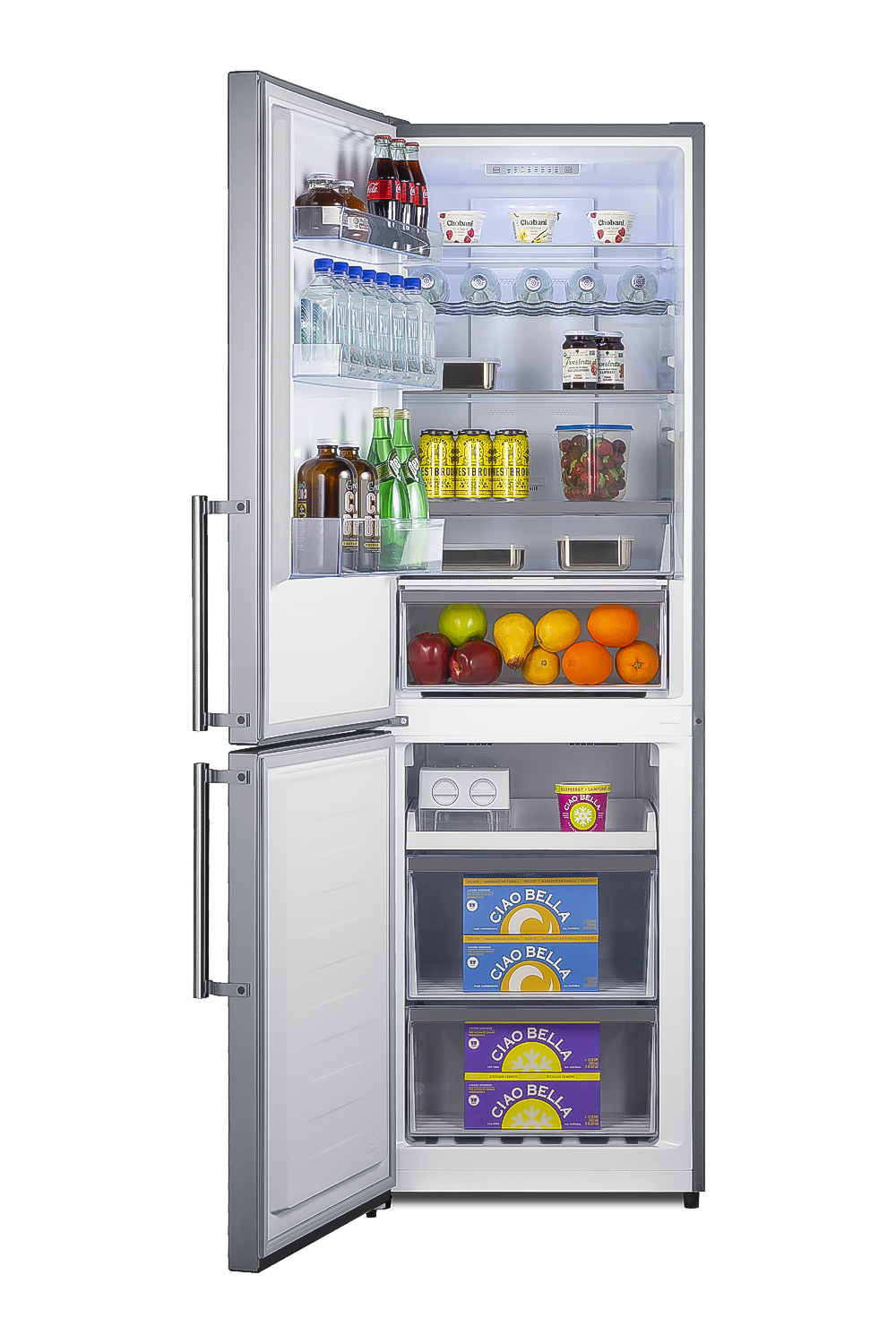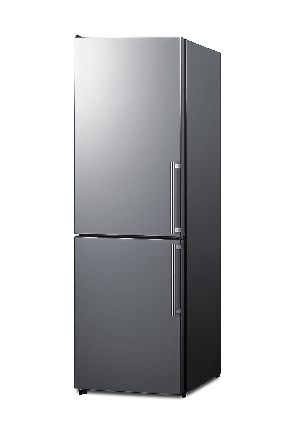 Summit's thin-line series of ENERGY STAR-certified counter-depth bottom freezer refrigerators conserves energy and space but adds quality and function with innovative features, convenient sizes, and energy-efficient operation. At 23.25" deep and 23.5" wide, the FFBF235PLLHD offers 10.8 cu. Ft. of storage capacity, ideal for space-challenged kitchens with complete refrigeration needs.The doors and drawers come in a stainless steel look with a horizontal grain, offering a luxurious appearance with fingerprint-resistant convenience, paired with two handles in the same finish. The side cabinet features a textured gray finish. The unit features a sealed back and right-angle plug for added space savings in smaller kitchens. This unit ships with a left-hand door swing.Inside, the FFBF235PLLHD comes fully featured for maximum storage convenience with frost-free operation ideal for minimum maintenance. The refrigerator section includes adjustable shelves made from safety glass for durability and easy cleaning. An innovative touch control system lets you manage the refrigerator and freezer temperature with an intuitive digital thermostat. Super Freeze setting allows you to rapidly cool the freezer section, which is ideal for newly loaded groceries.Our FFBF235PLLHD includes a large humidity-controlled crisper drawer and a second meat drawer that can hold colder temperatures for deli items or easily convert to a regular crisper. The large freezer section features one shelf and two slide-out storage drawers with clear plastic fronts. These fronts help to protect your frozen goods from warmer ambient temperatures when the door is opened. With its elegant design, unique size, and complete storage capacity, the FFBF235PLLHD is the perfect energy-efficient addition to any kitchen looking to bring true quality, modern style, and energy savings in a smaller footprint than standard household refrigerators.This is a bottom-mount freezer model. Alternative units are also available in dif