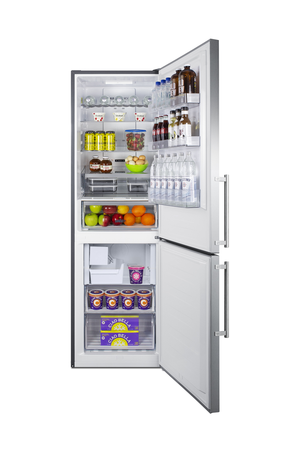 Bring European luxury to small kitchen spaces with Summit's premium counter depth bottom freezer refrigerators, sized with a 24 inch footprint for an easy fit and ENERGY STAR certified for an efficient performance. Model FFBF249SS2IM offers over 10 cu.ft. of storage capacity in a uniquely slim and shallow fit under 24". The real stainless steel doors feature a vertical grain and a gentle curve, with pro style handles and a textured gray cabinet to complete the elegant, modern look. The sealed back and right angle plug help to ensure a clean fit. This unit comes with a right hand door swing (see model FFBF249SS2IMLHD or add option LHD to have this reversed). Designed and manufactured in Europe, the FFBF249SS2 features advanced cooling technology. The digital control panel is located on the door's front, allowing you to adjust the refrigerator or freezer temperature without opening the door. Audible and visual high temperature and open door alarms helps to protect stored contents, while the child lock prevents unnecessary adjustments. The frost-free interior utilizes a MultiFlow Fan system to evenly distribute temperature. This refrigerator is designed with AdaptTech, adaptive intelligent technology that adjusts the cooling to your habits based on the frequency of door openings. Additional features include a fast freeze setting (ideal for loading groceries) and an eco setting. Inside, the FFBF249SS2IM is designed to maximize storage convenience with LED lighting providing a clean display. The refrigerator section includes two slide-out adjustable shelves in spill-proof glass with stainless steel front trim for an attractive look. We also include an adjustable scalloped steel rack to hold bottles in place. Three removable door shelves offer flexible condiment and bottle storage. This unit includes a large humidity-controlled crisper drawer and a FreshZone deli drawer that can hold colder temperatures for meat or be converted to regular crisper conditions with an easy s