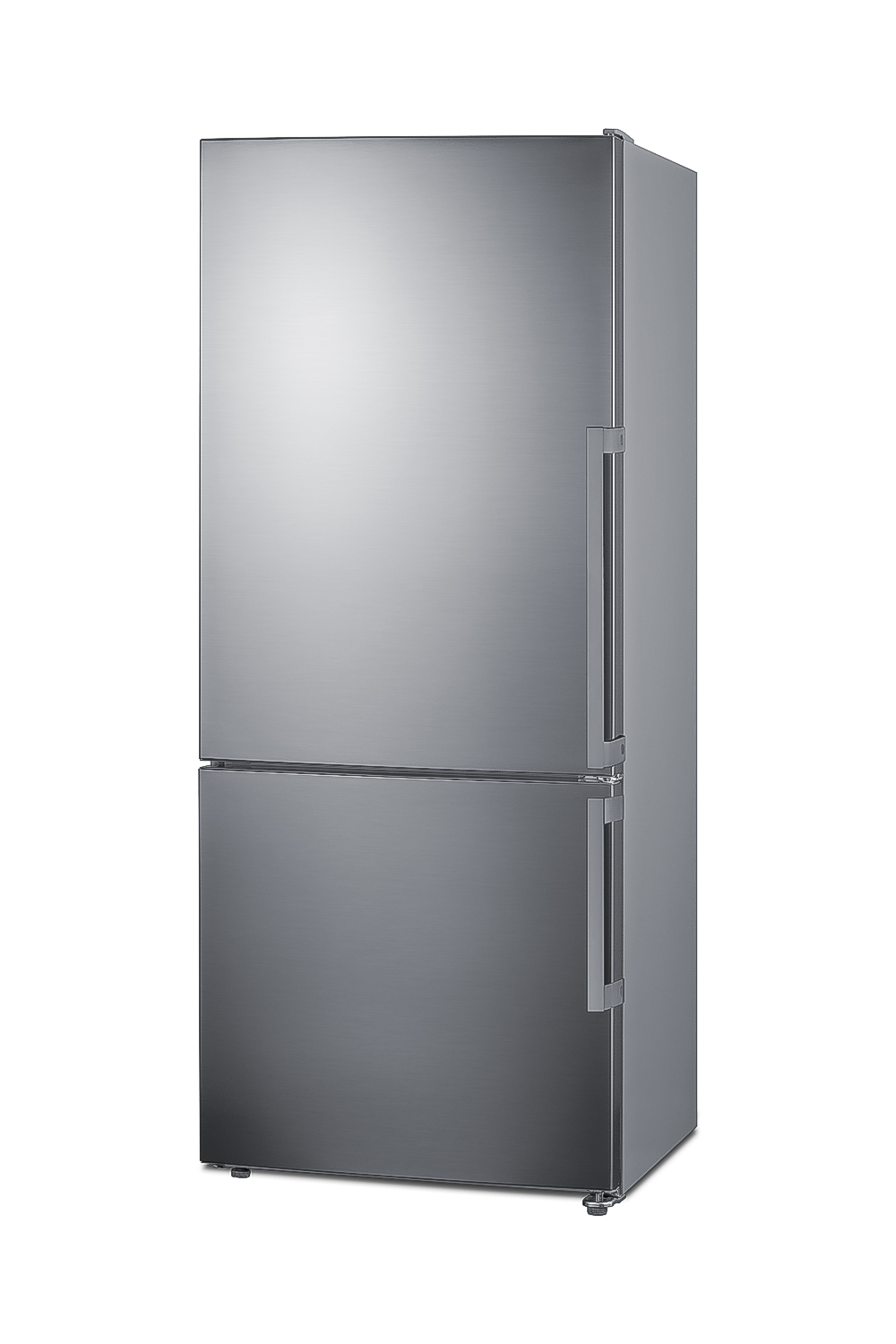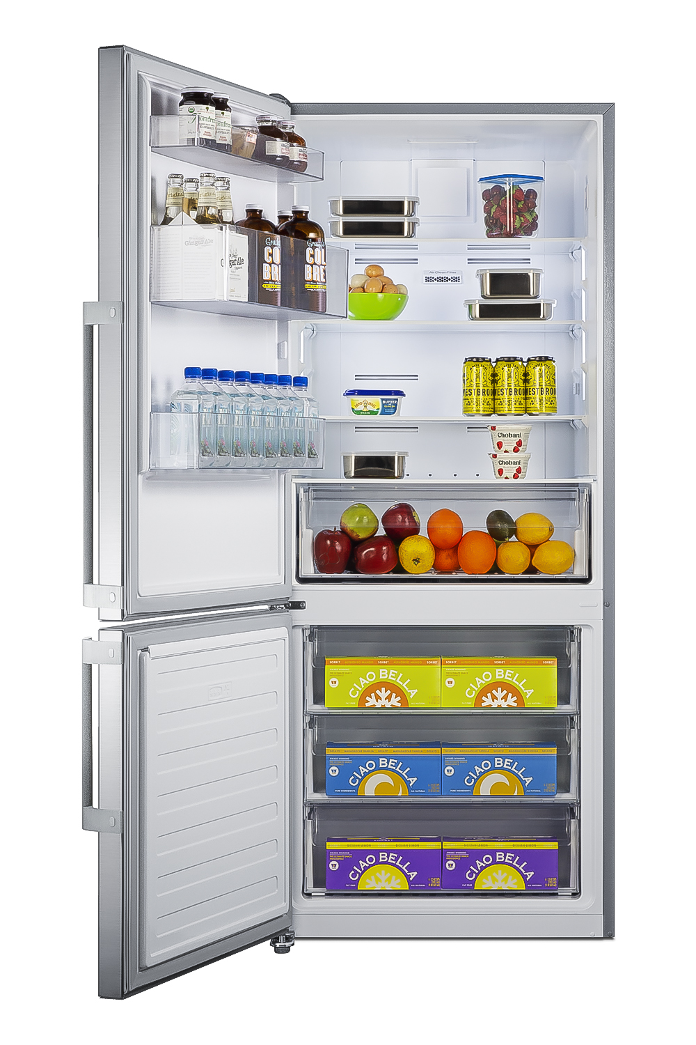 SUMMIT's thin-line series of ENERGY STAR certified counter depth bottom freezer refrigerators conserves energy and space but adds quality and function with innovative features, convenient sizes, and energy efficient operation.At just 26.25" deep and 27.63" wide, the FFBF283SSLHD offers a generous 14 cu.ft. of storage capacity ideal for space-challenged kitchens with full refrigeration needs. This unit comes with a textured gray cabinet and real stainless steel doors featuring a horizontal grain and protective film that helps to keep the door clean from fingerprints and smudges. Pro style handles complete the look. It ships with left hand door swing (for a right hand version, see model FFBF283SS).Inside, the FFBF283SSLHD comes fully featured for maximum storage convenience with frost-free operation ideal for minimum maintenance. The refrigerator section includes adjustable shelves made from safety glass for durability and easy cleaning. Three adjustable door racks offer additional storage options, including one deep rack that can accommodate full gallon sized containers. The large clear crisper is ideal for keeping produce fresh. An innovative touch control system lets you manage the refrigerator and freezer temperature with an intuitive digital thermostat. LED lighting in the side walls of the refrigerator offers an efficient and attractive view inside. The open door alarm alerts with an audio and visual signal when the door is left ajar for over one minute. This unit is equipped with an optional sabbath mode feature that allows you to deactivate certain electrical features for up to 76 hours. The lower freezer compartment features three slide-out drawers with plastic fronts to help protect stored items when the door is opened. For this unit with an icemaker, see the FFBF284SSIMLHD.With its elegant design, unique size, and full storage capacity, the FFBF283SSLHD is the perfect energy efficient addition to any kitchen looking to bring true quality, modern style, and