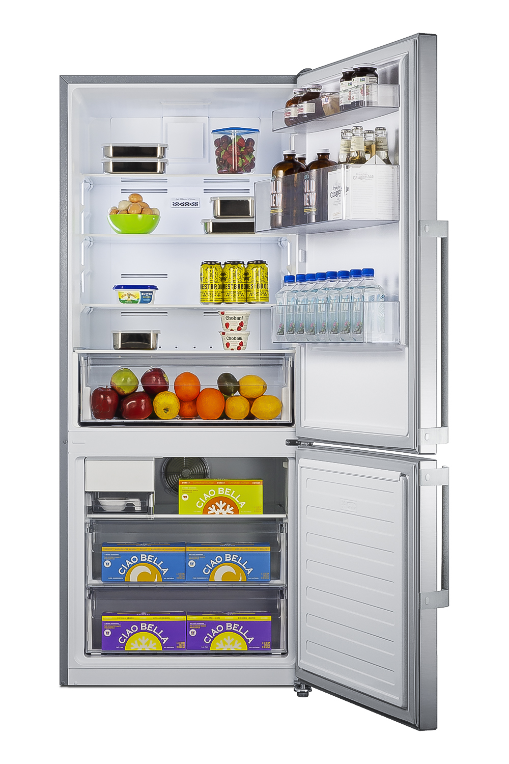 SUMMIT's thin-line series of ENERGY STAR certified counter depth bottom freezer refrigerators conserves energy and space but adds quality and function with innovative features, convenient sizes, and energy efficient operation.At just 26.25" deep and 27.63" wide, the FFBF284SSIM offers nearly 14 cu.ft. of storage capacity ideal for space-challenged kitchens with full refrigeration needs. Reversible doors allow you to adjust the door swing to best suit your space. This unit comes with a textured gray cabinet and real stainless steel doors featuring a horizontal grain and protective film that helps to keep the door clean from fingerprints and smudges. Pro style handles complete the look.Inside, the FFBF284SSIM comes fully featured for maximum storage convenience with frost-free operation ideal for minimum maintenance. The refrigerator section includes adjustable shelves made from safety glass for durability and easy cleaning. Three adjustable door racks offer additional storage options, including one deep rack that can accommodate full gallon sized containers. The large clear crisper is ideal for keeping produce fresh. An innovative touch control system lets you manage the refrigerator and freezer temperature with an intuitive digital thermostat. LED lighting in the side walls of the refrigerator offers an efficient and attractive view inside. The open door alarm alerts with an audio and visual signal when the door is left ajar for over one minute. This unit is equipped with an optional sabbath mode feature that allows you to deactivate certain electrical features for up to 76 hours. The lower freezer compartment features two slide-out drawers with plastic fronts to help protect stored items when the door is opened. A factory-installed icemaker keeps a full supply of ice on hand.With its elegant design, unique size, and full storage capacity, the FFBF284SSIM is the perfect energy efficient addition to any kitchen looking to bring true quality, modern style, and energy