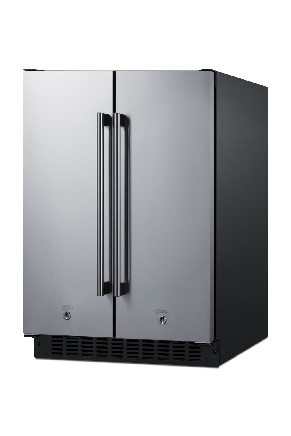 SUMMIT brings quality and value under the counter with the industry’s largest collection of built-in refrigeration. Sized at 24" wide, the FFRF24SS is an all-in-one side-by-side refrigerator-freezer. The front breathing design allows built-in installation under counters, while the fully finished black cabinet also enables freestanding use. This unit features stainless steel wrapped doors with a horizontal grain and pro style handles. Each compartment has a factory installed front lock for added security. The sealed rear and right angle plug offer a better fit.Inside, the FFRF24SS features a frost-free freezer compartment on the left and a frost-free refrigerator compartment on the right. The refrigerator includes a digital thermostat allowing users to manage the temperature in each compartment, with a readout in Celsius or Fahrenheit for added convenience. Adjustable glass shelves offer cleaner spill-proof storage for fresh food items, while two removable door shelves provide additional storage space as needed. An internal fan assures the compartment is cooled evenly from top to bottom. The freezer compartment includes adjustable wire shelves to ensure proper cold air circulation. Both sides feature LED lighting to provide an attractive, energy efficient presentation. The slotted floor design is ideal for keeping bottles safely in place. Additional features include an open door alarm, high temperature alarm, and Sabbath mode setting that allows you to disable certain functions during religious observance. With its innovative all-in-one design, user-friendly features, and full frost-free operation, the FFRF24SS is a great choice for smaller kitchens looking to maximize storage space under the counter.