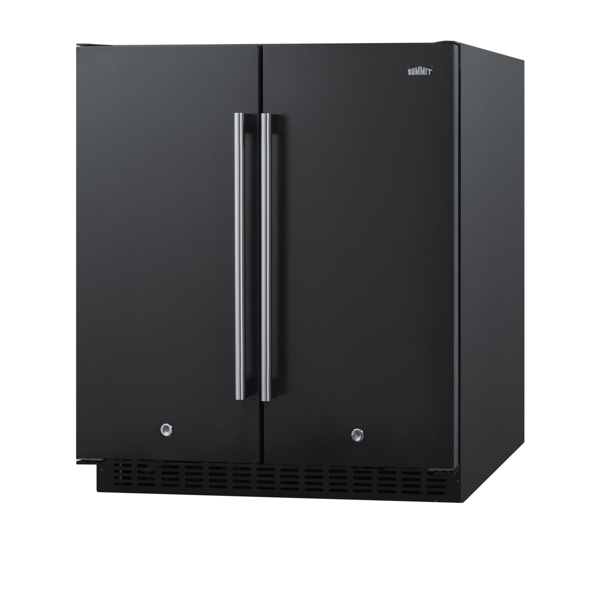 SUMMIT brings quality and value under the counter with the industry’s largest collection of built-in refrigeration. Sized at 30" wide, the FFRF3070B is an all-in-one side-by-side refrigerator-freezer. The front breathing design allows built-in installation under counters, while the fully finished cabinet also enables freestanding use. This unit features a jet black exterior with stainless steel handles. Each compartment has a factory installed front lock for added security. The sealed back ensures easier cleanup with added space savings. Inside, the FFRF3070B features a 2.4 cu.ft. frost-free freezer compartment on the left and a 3 cu.ft. frost-free refrigerator compartment on the right. The refrigerator includes a digital thermostat allowing users to manage the temperature in each compartment, with a readout in Celsius or Fahrenheit for added convenience. Adjustable glass shelves offer cleaner spill-proof storage for fresh food items, while two removable door shelves provide additional storage space as needed. An internal fan assures the compartment is cooled evenly from top to bottom. The freezer compartment includes adjustable wire shelves to ensure proper cold air circulation. Both sides feature LED lighting to provide an attractive, energy efficient presentation. The slotted floor design is ideal for keeping bottles safely in place. Additional features include an open door alarm, high temperature alarm, and Sabbath mode setting that allows you to disable certain functions during religious observance. With its innovative all-in-one design, user-friendly features, and full frost-free operation, the FFRF3070B is a great choice for smaller kitchens looking to maximize storage space under the counter.