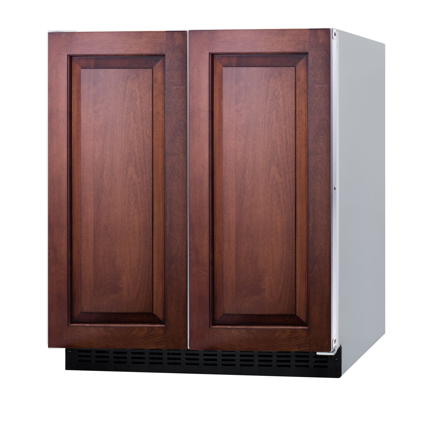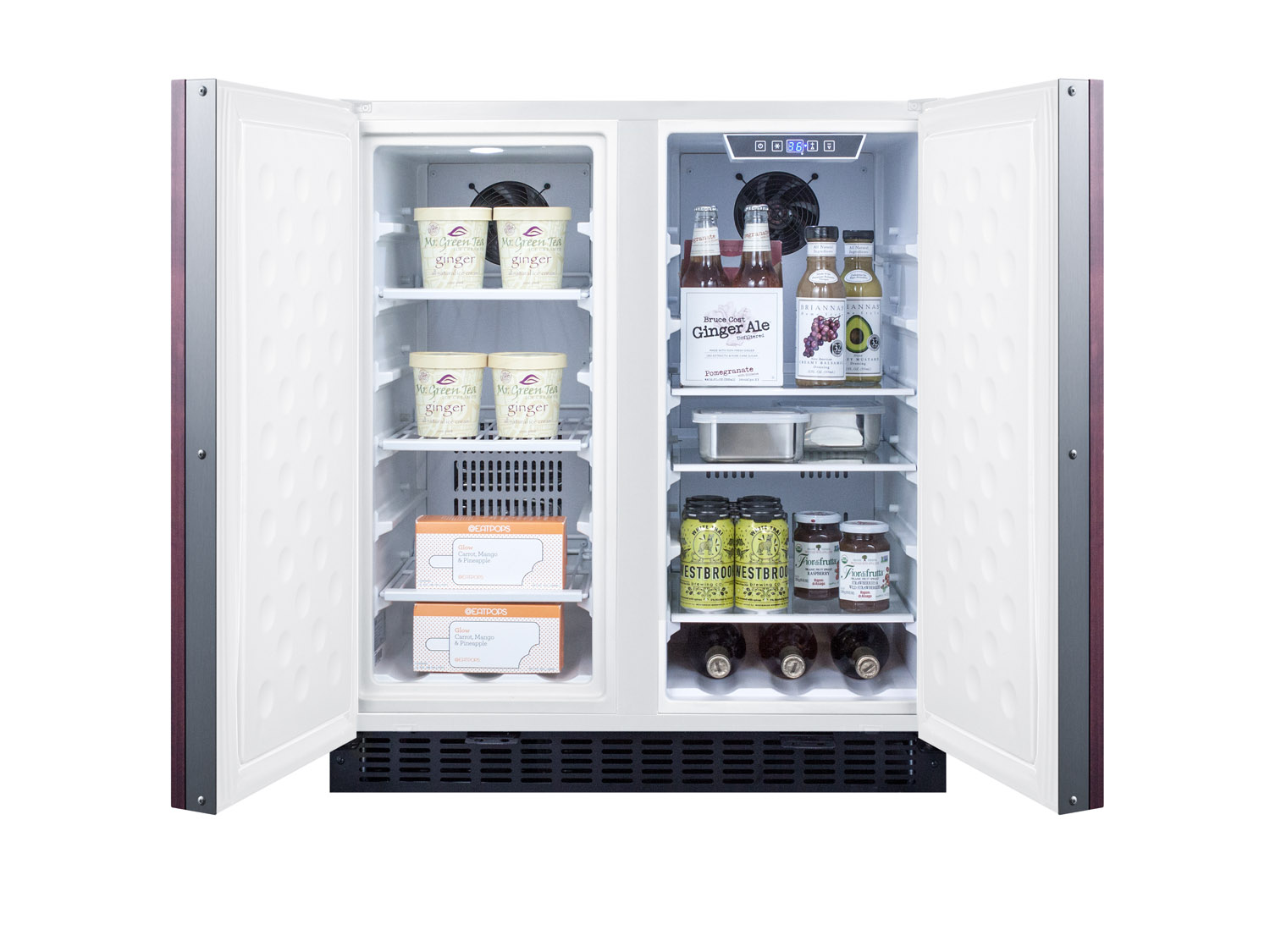 SUMMIT brings quality and value under the counter with the industry’s largest collection of built-in refrigeration. Sized at 30" wide, the FFRF3075WIF is an all-in-one side-by-side refrigerator-freezer. The front breathing design allows built-in installation under counters, while the fully finished white cabinet also enables freestanding use. The French swing doors feature an integrated stainless steel frame that lets users install their own overlay panels for a custom look (panel size: 30" H x 14 5/8" W). Users install their own handles. The sealed back ensures easier cleanup with added space savings. Inside, the FFRF3075WIF features a 2.4 cu.ft. frost-free freezer compartment on the left and a 3 cu.ft. frost-free refrigerator compartment on the right. The refrigerator includes a digital thermostat allowing users to manage the temperature in each compartment, with a readout in Celsius or Fahrenheit for added convenience. Adjustable glass shelves offer cleaner spill-proof storage for fresh food items, while two removable door shelves provide additional storage space as needed. An internal fan assures the compartment is cooled evenly from top to bottom. The freezer compartment includes adjustable wire shelves to ensure proper cold air circulation. Both sides feature LED lighting to provide an attractive, energy efficient presentation. The slotted floor design is ideal for keeping bottles safely in place. Additional features include an open door alarm, high temperature alarm, and Sabbath mode setting that allows you to disable certain functions during religious observance. With its innovative all-in-one design, user-friendly features, and full frost-free operation, the FFRF3075WIF is a great choice for smaller kitchens looking to maximize storage space under the counter.