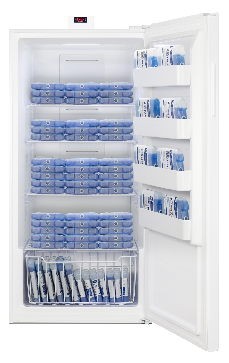 Accucold's general purpose series offers reliable cold storage in a variety of designs, including full-sized freezers with frost-free operation for low maintenance use.Model FFUF234 is an upright all-freezer with a full 21 cu.ft. storage capacity. It comes in a white exterior finish with a right hand door swing and powerful seal to ensure items are protected. This unit has a sealed back for easier cleanup and a right angle cord to allow a better fit. The digital control panel is located on top of the cabinet, allowing you to manage the interior temperature without opening the door. The FFUF234 is designed to operate between -25 to -10ºC. For a matching all-refrigerator, see the FFUR23.The FFUF234 utilizes frost-free operation, eliminating the need to manually defrost the interior. Adjustable wire shelves accommodate a variety of sizes, with a removable lower basket for additional storage. Four door racks are included. This unit features LED lighting for an efficient view.With its low maintenance design and large storage capacity, the FFUF234 is ideal for storing non-critical products in research, clinical, and industrial laboratory applications.