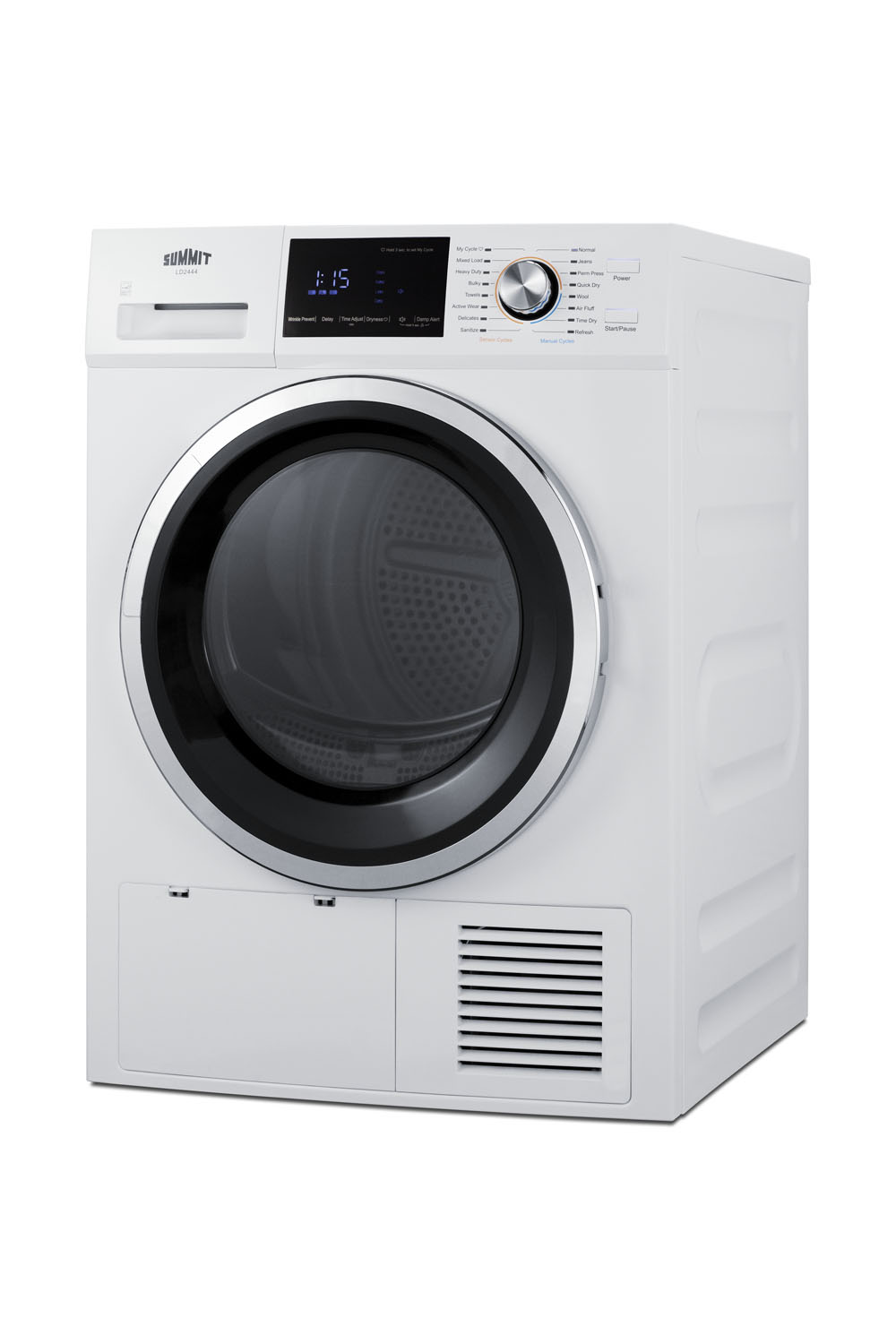 Summit's selection of slim-fitting laundry options brings efficiency and convenience to apartments, tiny houses, and other homes with limited floor space. Model LD2444 is an ENERGY STAR certified 208-240V non-vented heat pump dryer. Sized just under 24" wide, it features a generous 4.4 cu.ft. interior. It comes in a clean white finish with a ridged stainless steel drum. This unit is designed for professional installation to a 3 or 4-wire connection based on your local code. For added space savings in small homes, this dryer can be placed in closets or alcoves for recessed installation (minimum clearance: 1" on each side, 2" at the top, rear, and front). A combination of dial and digital controls ensures easy and intuitive use with a large LED readout of your drying progress. Choose from 15 dry programs including options for wool, air fluff, jeans, delicates, and permanent press to help reduce wrinkles. Additional features include a child lock, 24 hour delay start, add garment function, and lint filter to ensure a cleaner performance. For improved water and energy savings, the LD2444 utilizes modern heat pump technology. This 2-stage drying system helps to allow more versatile placement and increased efficiency by separating the moisture produced by your dryer from hot air. The water is collected by the upper condensation tank and must be emptied (an icon on the digital screen will remind you after each dry cycle). This dryer can be paired with the matching 115V LW2427 washer to create a complete set. A stacking kit with a slide-out rack will be available later this summer. Additional laundry options are available, including all-in-one 115V combination washer/dryers. Browse the complete Summit line to explore your options.