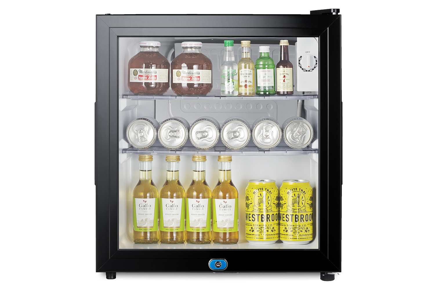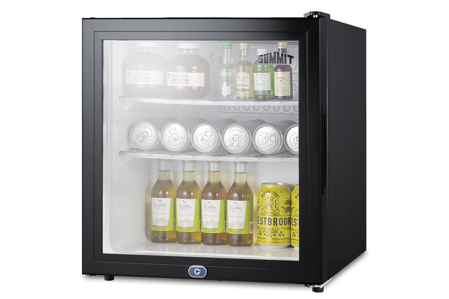 Summit manufactures a selection of minibars perfectly sized for compact hospitality spaces and featured for easy guest use.Sized just under 18 inches wide, the MB43GL is a compact glass door minibar. Its fully finished cabinet, in a glossy jet-black finish, allows for freestanding use, while the user-reversible door affords variation in placement. It features a double pane tempered glass door and a crisp, white interior, which allows for easy viewing of stored items. A factory-installed lock offers additional security. Inside, the MB43GL has 1.5 cu. ft. of storage space paired with a compressor-based cooling system that ensures proper refrigeration to keep items cold. Meanwhile, the laboratory-tested operation keeps it quiet with a sound level just under 35 decibels, sure not to disturb guests' sleep. Two removable plastic shelves offer versatile storage, with flat bottoms to help keep bottles standing and perforation to ensure more efficient cooling. Automatic defrost ensures minimum user maintenance.With a compact size and user-friendly design, the MB43GL is the perfect choice for hotels, offices, and other settings needing reliable, quiet cooling in a slim design.NOTE: For hotels and other spaces looking to install this minibar inside a cabinet or credenza, contact our product specialists at 718-893-3900 ext. 507 for details.