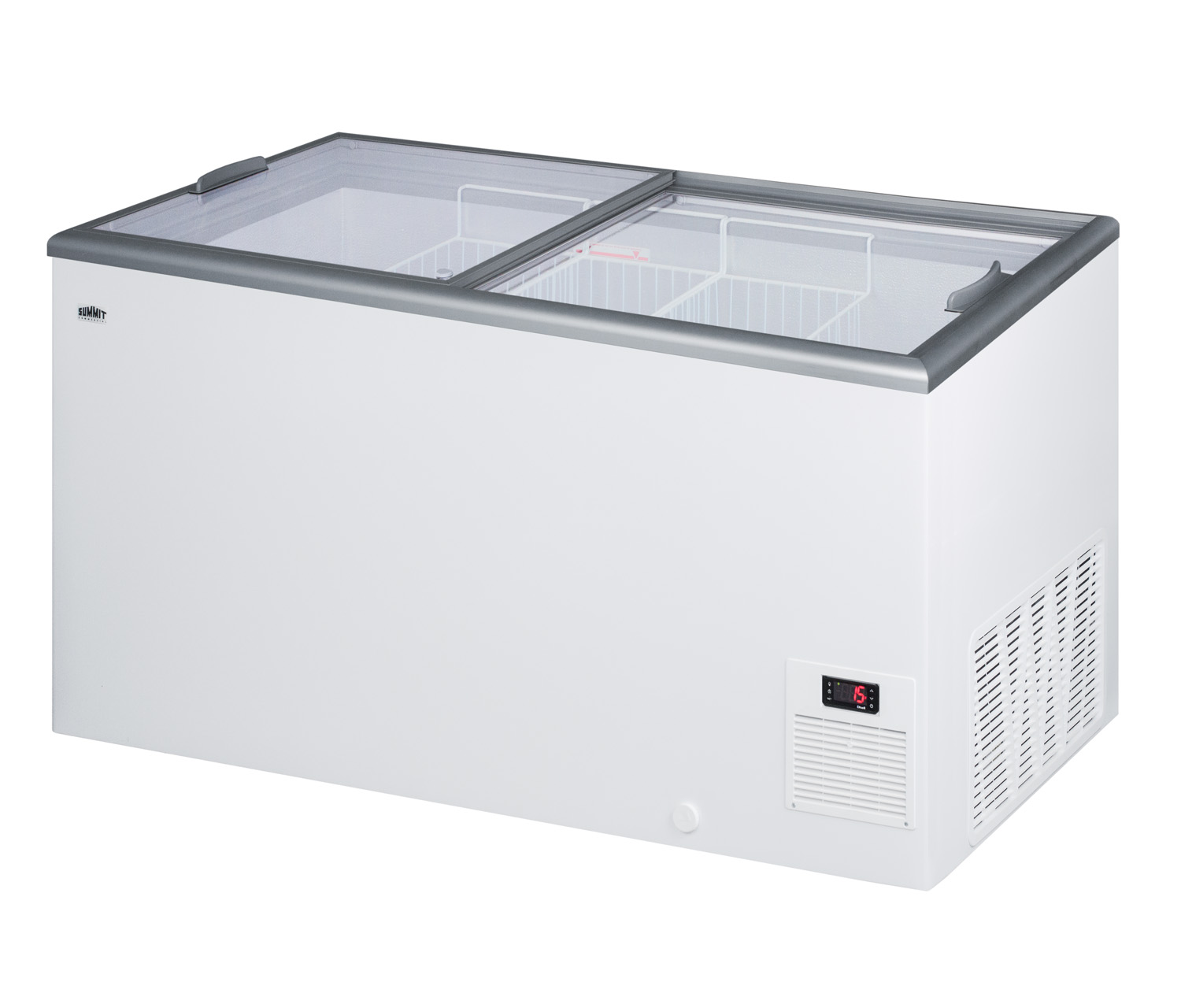 Summit Commercial's line of flat top ice cream freezers features a deluxe European design to provide quality storage and long-lasting convenience. Made for us by Elcold in Denmark, the NOVA45 features two tempered glass lids on ball-bearing glides that open and close smoothly to save your staff time and ensure ice cream isn't overexposed to warmer air temperature. This unit includes a removable keyed lock to allow users the option of securing their goods. The white cabinet suits any setting, while the gray lid trim offers an added touch of clean style. We include a set of sturdy commercial casters for users to install if they prefer the freezer more mobile. The digital thermostat is externally located for easy temperature management, with a wide range from -13 to 23ºF to accommodate a variety of desserts. We pre-set the unit to -4ºF.Inside, the NOVA45 features a steel interior in a clean white finish designed for lasting durability in busy commercial settings. We include three epoxy coated wire novelty baskets, ideal for storing frozen treats and designed to easily glide back and forth as needed. This unit utilizes a manual defrost cooling system with environmentally friendly R290a cooling agent and extra thick insulation to ensure added reliability. A drain is included for easy defrosting.The NOVA45 is UL-S listed to NSF-7 commercial standards. Additional sizes are available.