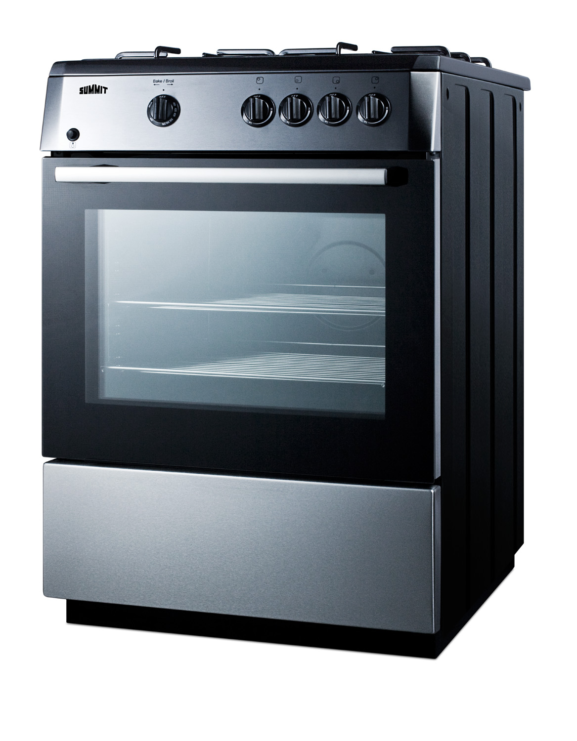 SUMMIT PRO24G is a 24" wide gas range with deluxe features and a unique European design.Designed and constructed in Europe, the PRO24G uses electronic ignition and includes four sealed Sabaf® burners, with a waist-high broiler located inside the oven for cooking convenience. The cooking surface is jet black, with two sets of continuous grates in a matching finish and a curved stainless steel manifold for a modern look. This 'slide-in' style range comes without a backguard, allowing you to integrate the unit into your own kitchen setup. Alternatively, we offer a 10" high backguard in stainless steel as an accessory for this unit (some assembly required). For this option, see the BG24.The PRO24G has a black trimmed oven door with a pro stainless steel handle and a window for easy monitoring. The oven includes a light and two slide-out racks with five positions to allow more flexibility in baking and broiling. A drop-down storage compartment offers added convenience.At 24" wide, the PRO24G is ideal for apartments and other small kitchens looking to add a touch of style in a slim-fitting size.