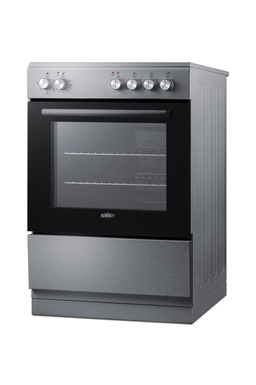 Summit's innovative series of European-made ranges offers full cooking convenience for apartments, ADUs, tiny homes, and other settings with limited kitchen space. Made in Europe, the REXT24SS is a 220V electric range sized at just under 24" wide with a depth under 24" making it ideal for L or U-shaped kitchens. For safer heating and easier clean-up, these units feature a smooth glass cooking surface. There are two 6" burners and two 8" burners to ensure the REXT24SS can accommodate various cooking needs.The versatile design includes a removable 2" high matching stainless steel backguard, allowing you the choice of a standard range style or a slide-in look with a flat surface that allows you to better integrate the unit with your own backsplash design. For added space savings, the REXT24SS features a slide-out drawer, perfect for storing your pots and freeing up more kitchen space.Inside, the REXT24SS features a large 2.44 cu.ft. oven made from durable porcelain enamel and includes two sliding wire racks with five positions to let you fit various dish sizes. The large oven window provides a full view of your cooking, with an interior light that automatically turns on with the oven. The oven door is constructed from low-e glass in black for a modern look, with a sleek stainless steel finish on the storage drawer and manifold. The REXT24SS comes with multiple cooking functions to cater to various cooking methods. The oven settings include: defrost, static cooking, convection(fan), broiling, and even a broiling + convection(fan) function. All cooking controls meet ADA guidelines since each is located upfront, eliminating the danger of reaching across the cooktop surface. For this unit in white or black see models REXT24W and REXT24BL. For a 20" wide unit, see model REXT20SS.Browse our website to view our complete collection of ranges and cooking appliance at summitappliance.com