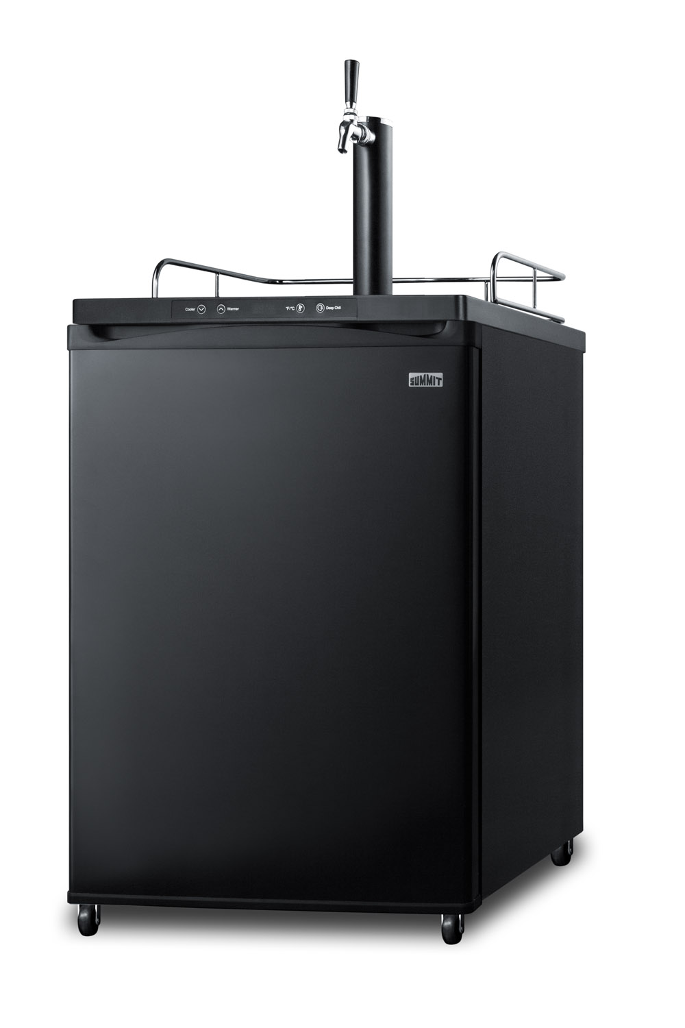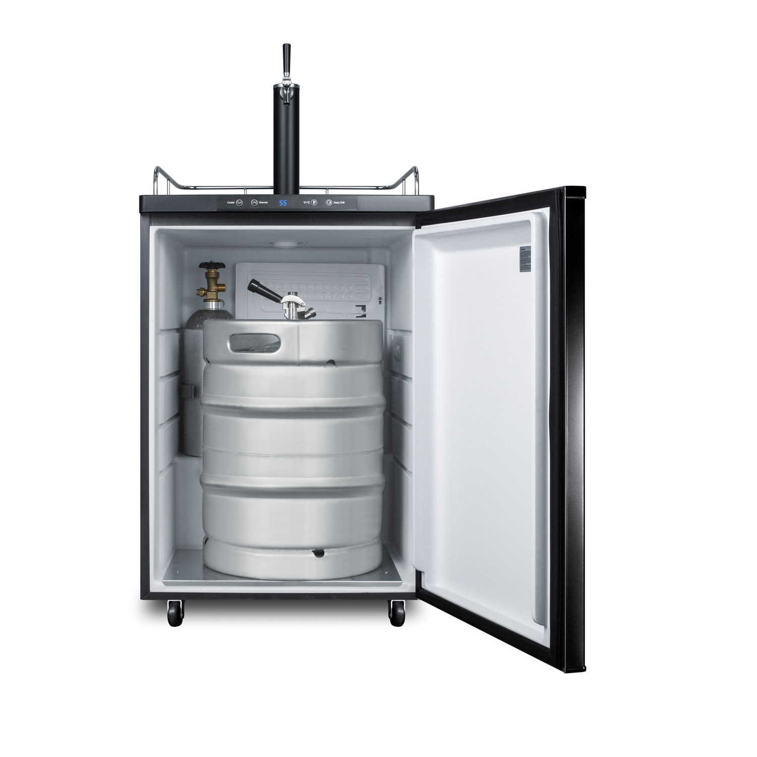 Summit Appliance offers a versatile line of full-sized freestanding beer dispensers designed for low maintenance storage in the style of your choice.The SBC635M features a large interior that can hold a full half, quarter, 1/6 or mini keg. It comes in a jet black finish with a matching Sankey tower. The surface includes a removable drip tray to collect spills and a chrome guard rail to help keep glasses and mugs in place. We include a set of locking casters for easy mobility. The user-reversible door swing makes it easy to accommodate any location’s setup.Automatic defrost operation ensures minimum user maintenance inside the 5.6 cu.ft. interior. A digital thermostat makes it easy to manage the temperature at the touch of a button. The external digital display shows the temperature in Celsius or Fahrenheit to ensure your beer is stored exactly how you like it. Our American Sankey tap kit includes all the accessories you need for draft service, including a regulator. The floor is reinforced with a steel cover for added durability when loading kegs.This unit is designed for freestanding use. For built-in applications, see the SBC635MBI.